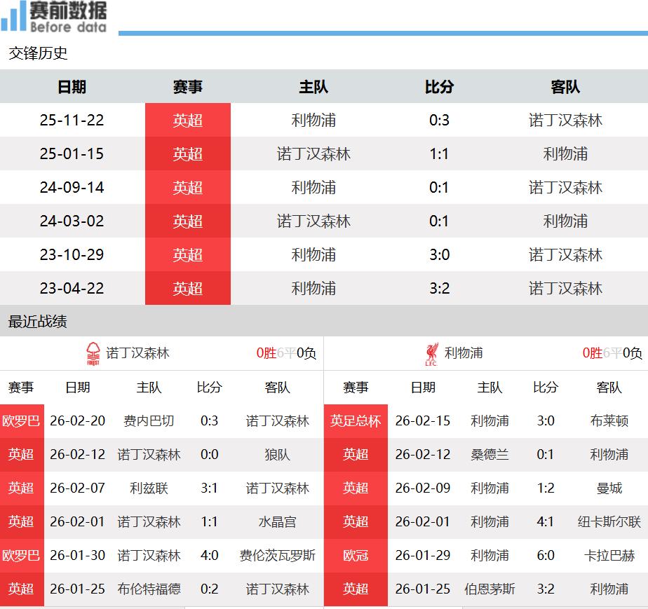 First:Team situationsAfter 27 rounds of the Premier League, Nottingham Forest holds 7 wins, 6 draws, and 13 losses with 27 points, just 2 points clear of the relegation zone; Liverpool has 12 wins, 6 draws, and 8 losses, sitting in sixth place with 42 points. In their last Premier League match, Nottingham Forest drew 0-0 at home against Wolves, marking their third consecutive league game without a win. Midweek, they secured a 3-0 away victory against Fenerbahçe in the Europa League playoff. Liverpool won 1-0 away at Sunderland and recently advanced to the fifth round of the FA Cup with a 3-0 home win over Brighton.
