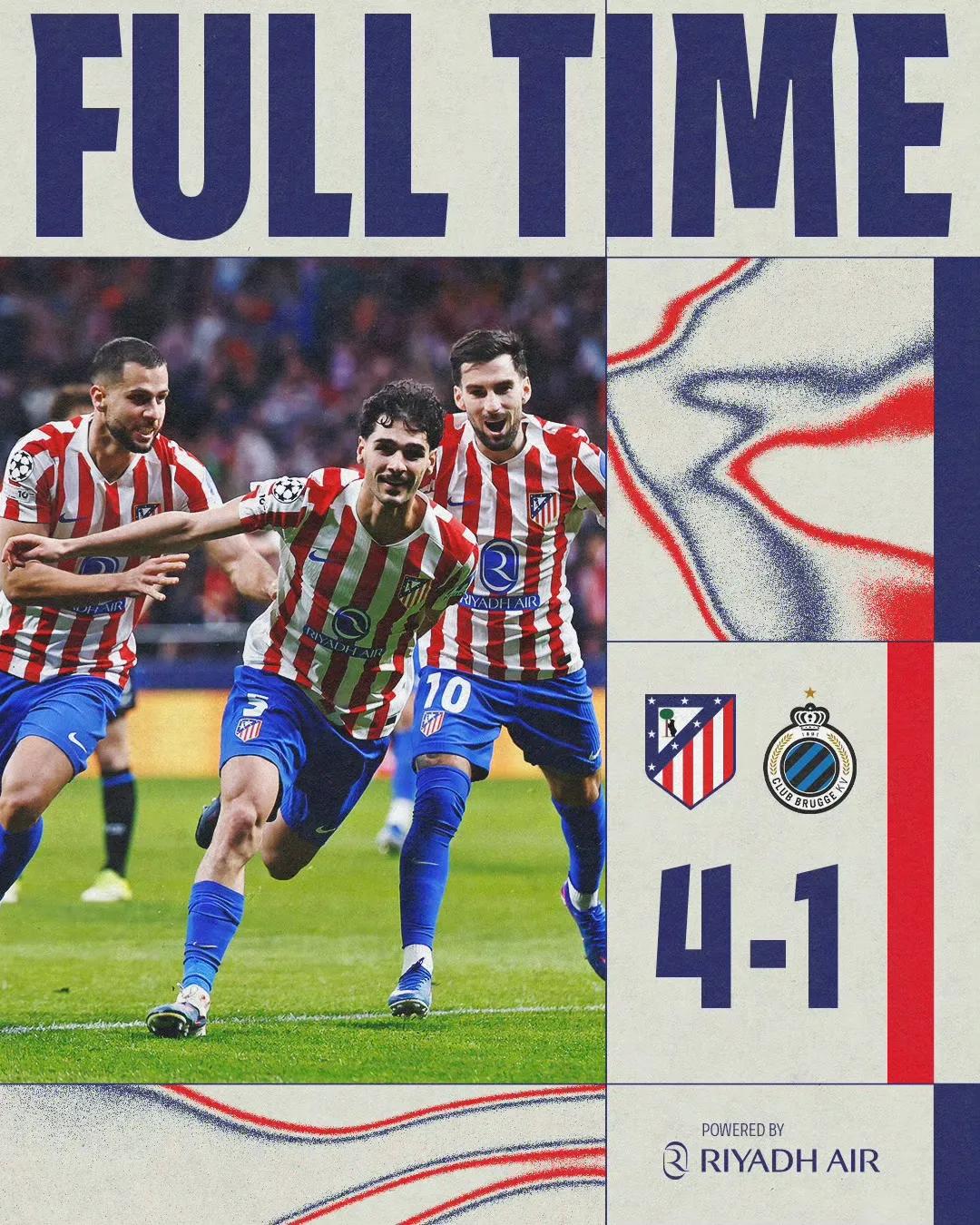 At 1:45 AM Beijing time on February 25, Atletico Madrid hosted Club Brugge. In the first half, Serrotti broke through defenders and shot low, with Minoletti making a costly error letting the ball slip into the net. Club Brugge later equalized from a corner via Odonius’ header at the back post. In the second half, Cadozo unleashed a stunning volley from the edge of the box to put Atletico ahead again, and Serrotti completed his hat-trick with two more goals. Atletico Madrid won 4-1 at home, advancing 7-4 on aggregate to the knockout stage.