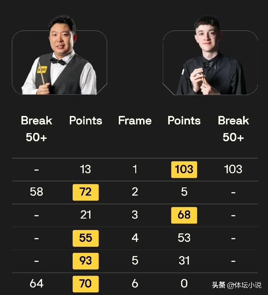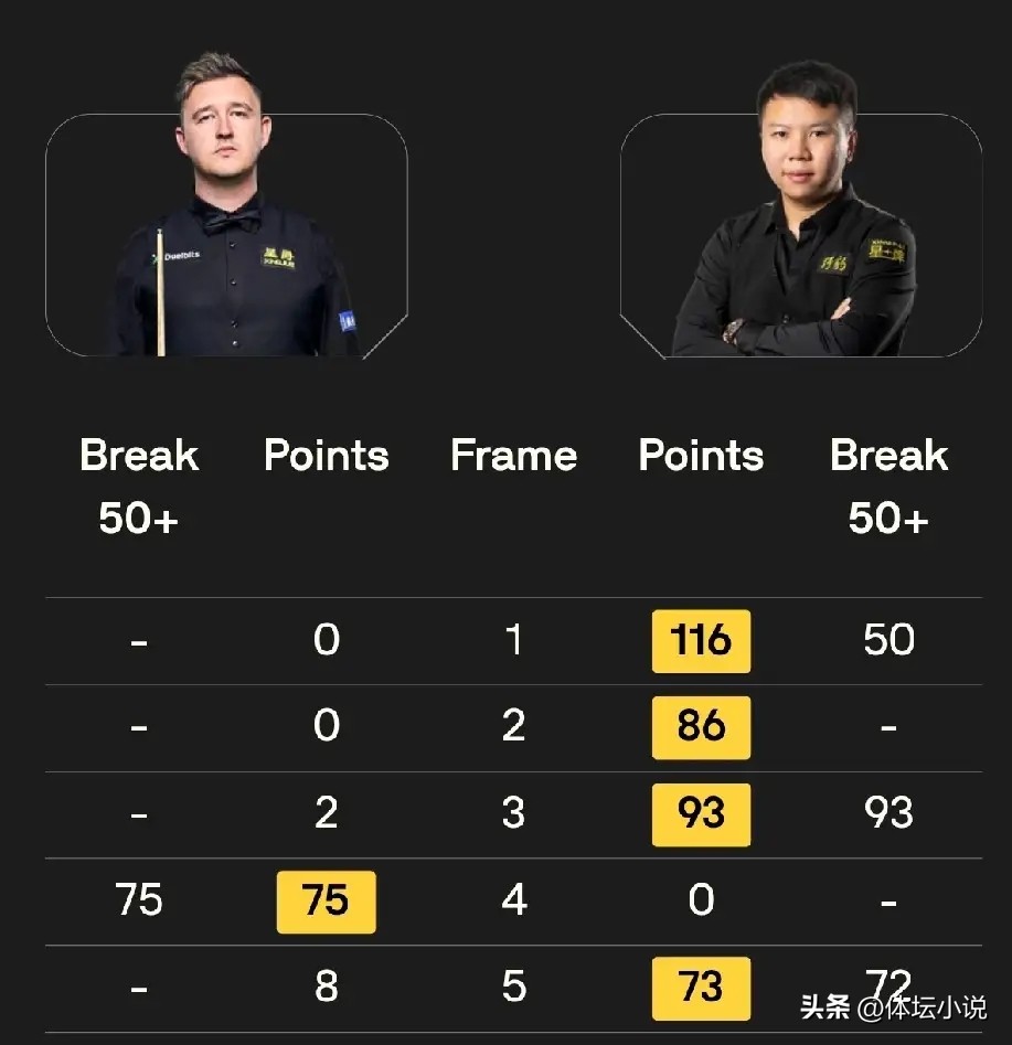 Zhou Yuelong vs. Kyren Wilson. Zhou Yuelong has finished as runner-up in ranking events four times; his skills are solid, but his mental resilience under pressure has been lacking. In the second round, he faced world number two Kyren Wilson, a young post-90s World Champion. Wilson’s form this season has been average, giving Zhou an opportunity for an upset. Indeed, Wilson continued his poor form, scoring only two points in the first three frames with no real chances, while Zhou produced two 50+ breaks to lead 3-0 and reach a match point. Wilson revived in the fourth frame with a 75 break to save one match point, but Zhou struck hard in the fifth, securing the frame with a 72 break and winning 4-1, causing a major upset to reach the last 16!