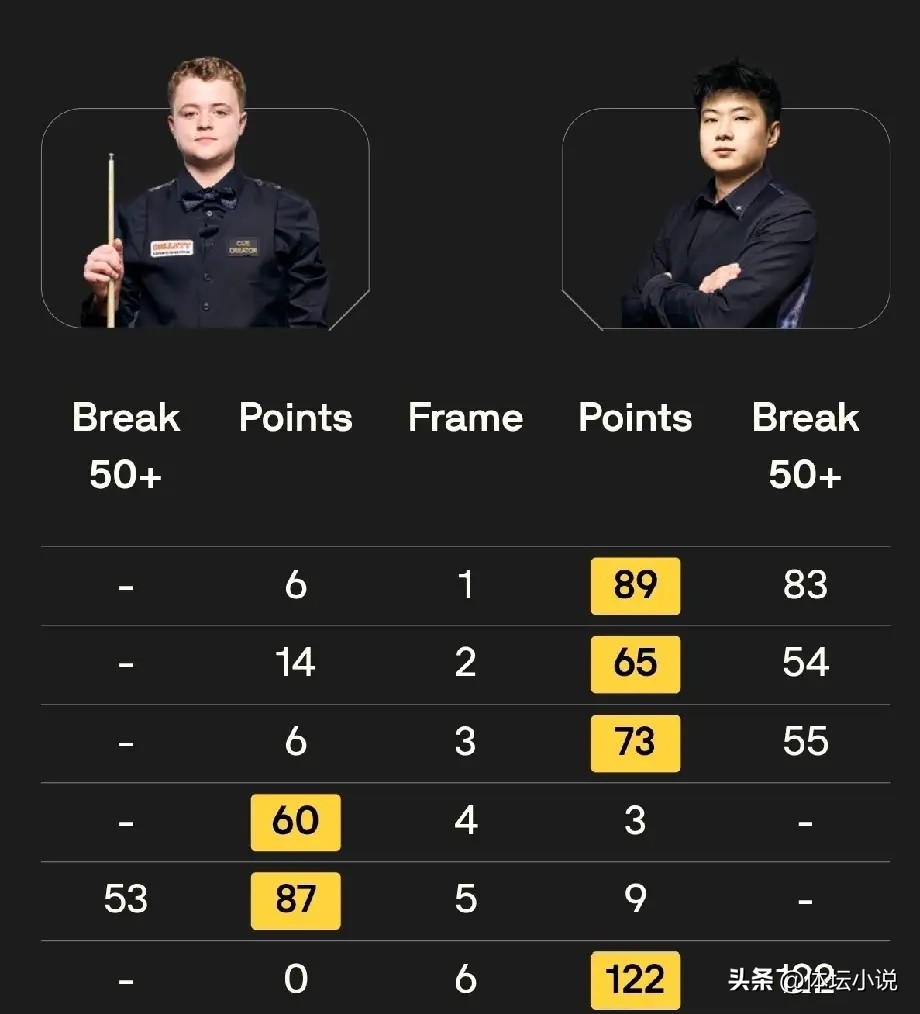 Zhao Xintong vs. Moody. Zhao Xintong is currently one of snooker’s hottest players, having won the Grand Prix and Players Championship back-to-back. Despite the tough schedule, he entered the Welsh Open aiming for a third consecutive title. After narrowly beating Fan Zhengyi 4-3 in the first round to extend his winning streak to ten, he faced rising star Moody, who had previously upset Ding Junhui. Zhao started fiercely, producing three 50+ breaks to take a 3-0 lead. Moody fought back with strong defense and attack, winning two frames to narrow it to 3-2. In the sixth frame, Zhao’s precision exploded as he delivered an unstoppable 122 break to seal a 4-2 victory and extend his winning streak to eleven!