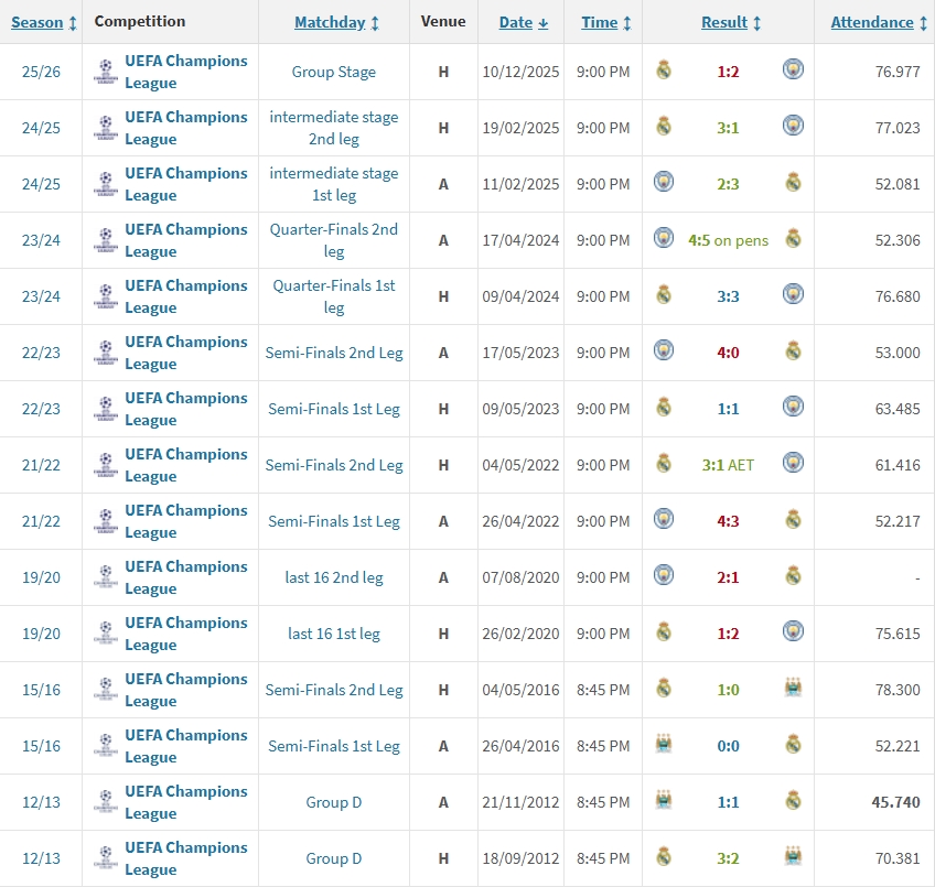 Tired of seeing it? Real Madrid faces Manchester City in the Champions League knockout stages for the 5th consecutive year, with a historical record of 6 wins, 4 draws, and 5 losses.