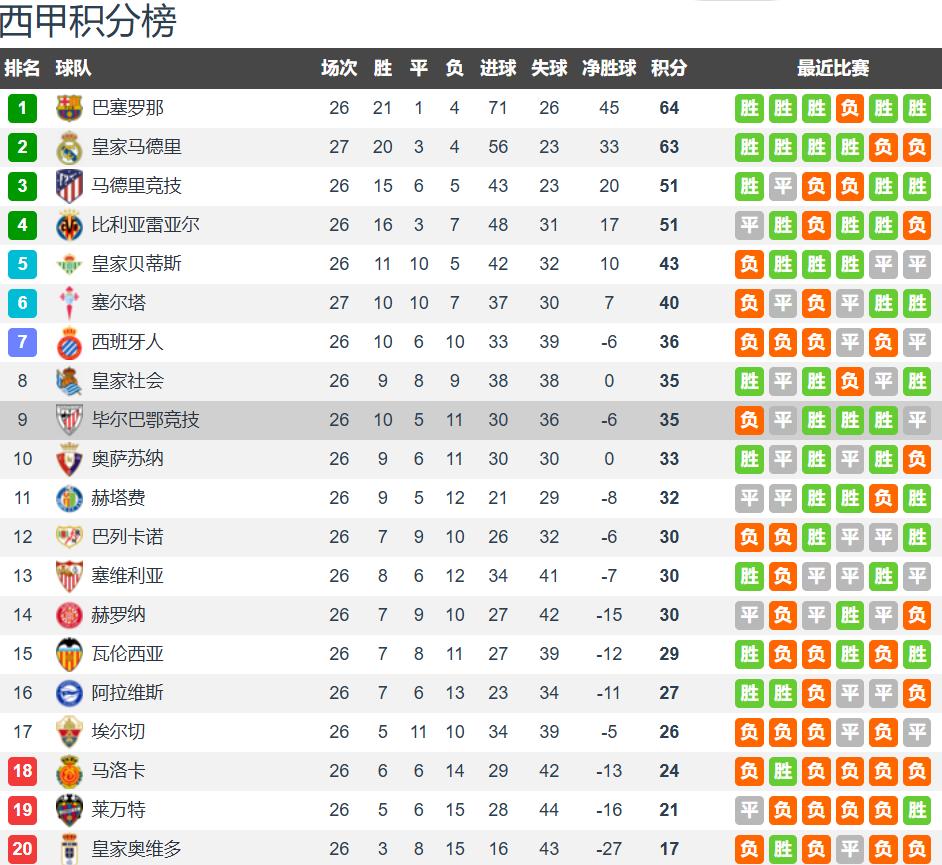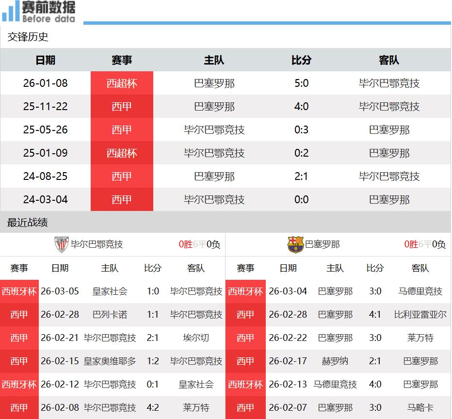 First:Situation of both teams! After 26 rounds of La Liga, Athletic Bilbao has 10 wins, 5 draws, 11 losses, 35 points ranking ninth, only 1 point behind the European qualification zone; Barcelona has 21 wins, 1 draw, 4 losses, 64 points ranking first, leading second-place Real Madrid (who played earlier) by 1 point. In the last La Liga round, Athletic Bilbao drew 1-1 away with Rayo Vallecano, unbeaten in 5 league rounds (3 wins, 2 draws); lost 0-1 to Real Sociedad in the Copa del Rey midweek and missed the final. Barcelona defeated top-four team Villarreal 4-1 at home, achieving two consecutive league wins, and beat Atletico Madrid 3-0 in the Copa del Rey midweek, but lost 3-4 on aggregate and missed the final.
