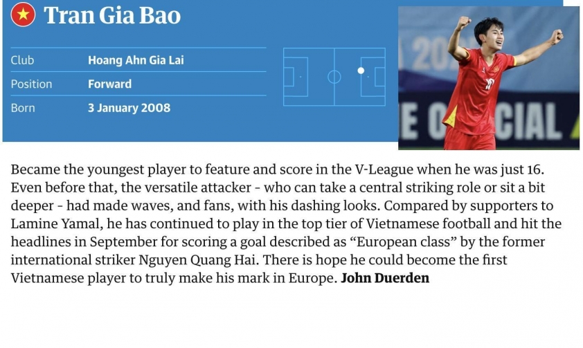 Being honored by The Guardian among the top 60 most promising young talents in the world for 2025 is a great pride for Gia Bao. However, accompanying that honor is also considerable pressure, as the young striker of HAGL will undoubtedly receive more attention and expectations from the media and fans in the coming time.
