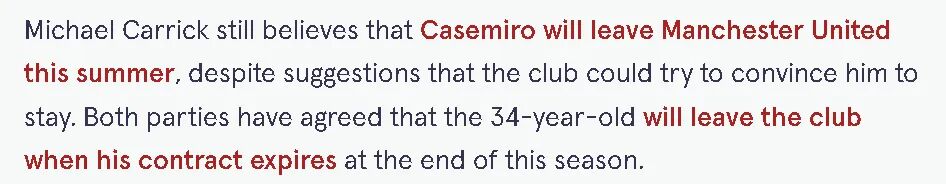 Carrick also reminded people that United always needs to find Casemiro's successor; he is already 34, and the challenges of multi-front competitions next season will be greater. Carrick denied the notion that finding a replacement for Casemiro is nearly impossible.