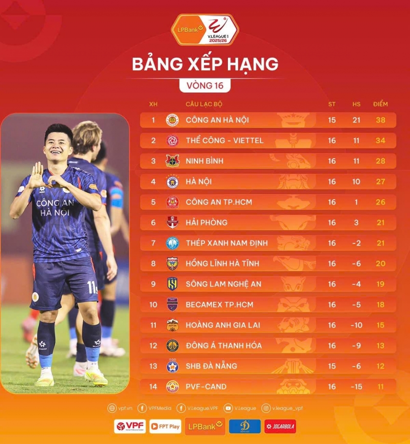 Previously, Nam Dinh also secured victories in rounds 14 and 15, raising their total points to 21 and temporarily ranking 6th on the standings. The gap with the upper group is no longer too large, especially as Ninh Binh has declined and fallen to third place with 28 points.