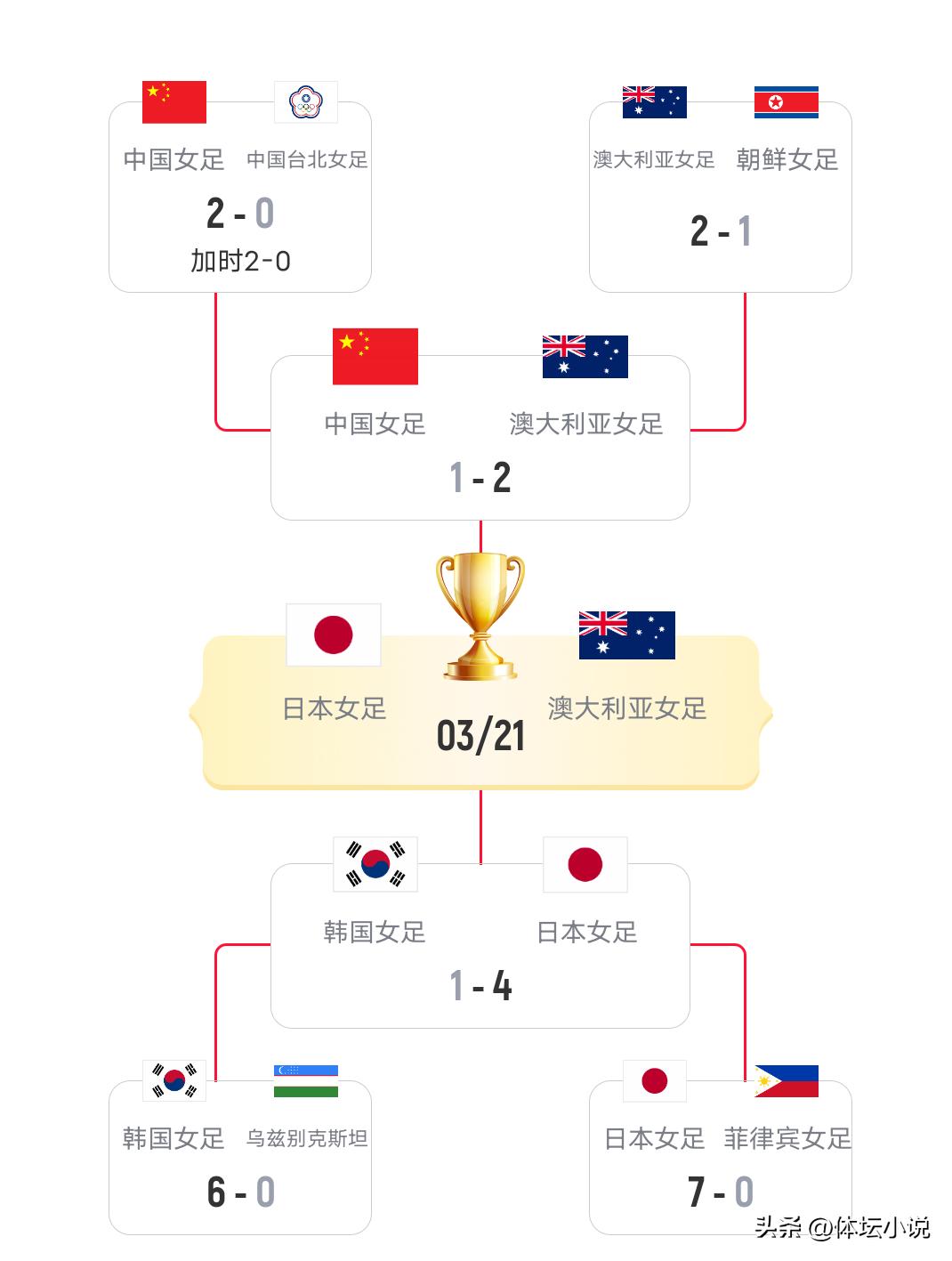 In another semifinal concluded earlier, host nation Australia women's football team relied on precise chance-conversion ability, scoring two goals from three shots on target, with counter-attacking prowess that was astonishing, defeating defending champion China women's football team 2-1, advancing unbeaten through five rounds to the final. Therefore, the final matchup is now set: Australia women's football team versus Japan women's football team, a heavyweight clash. As expected, Japan is有望以全胜战绩夺冠!