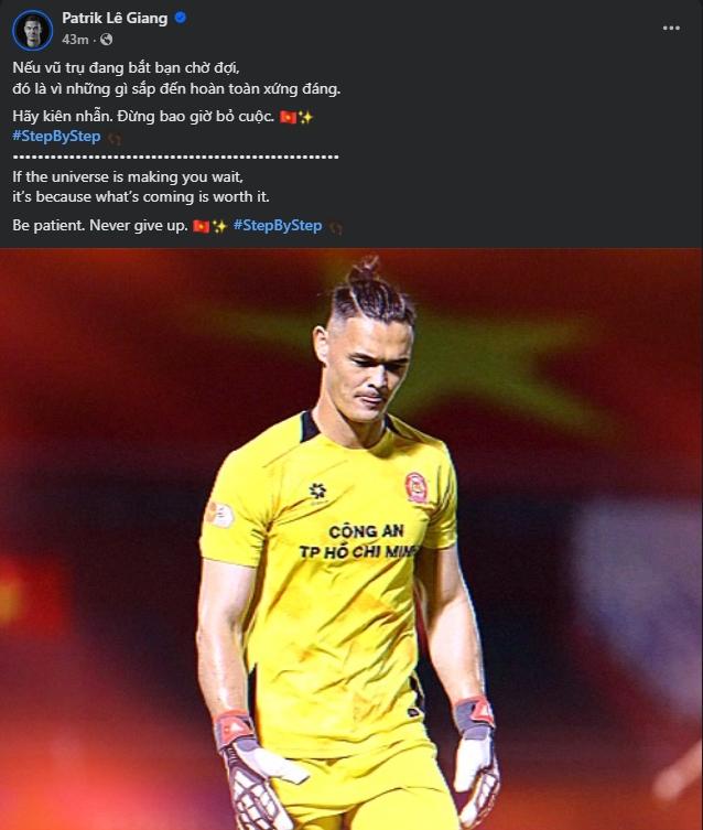 On his personal Facebook page, goalkeeper Patrik Lê Giang has just made his first move after not being included in the Vietnam national team lineup for the March FIFA Days. The Slovakian-born Vietnamese goalkeeper posted: "If the universe is making you wait, it's because what's coming is truly worth it. Be patient. Never give up," accompanied by the symbol of the Vietnamese national flag.
