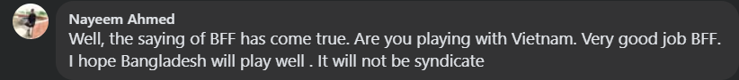 This person writes: "What BFF said has become reality. You are playing against Vietnam, very good BFF. I hope Bangladesh will play well and the match will be fair, without any arrangement".