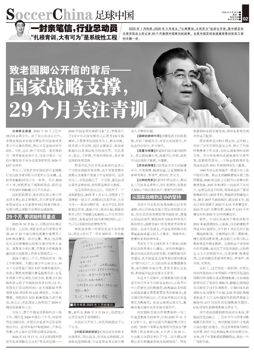 【A Handwritten Letter, Mobilizing the Entire Industry】 On March 24, Chinese Football Association President Song Kai issued an open letter, urging retired national team players to commit to youth training to solidify the foundation of Chinese football. The letter sparked lively discussions among media and fans. While praising Song Kai's efforts to rapidly develop China's youth training system, discussions also focused on the timing of the letter's release. Furthermore, to encourage all retired national team players to participate in Chinese football youth training, what supporting policies and measures should the Chinese Football Association implement? This newspaper conducted a detailed investigation and analysis on this matter.