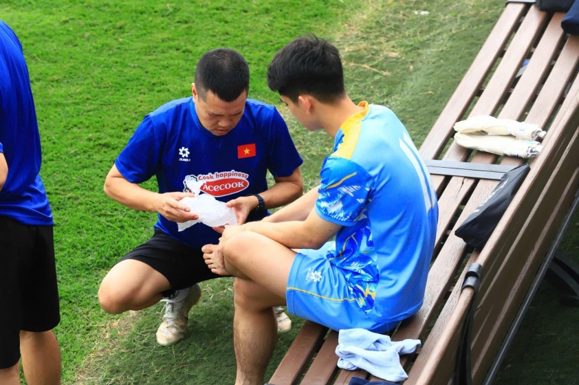 After missing two training sessions on March 28 and March 29 due to physical condition issues, Khuất Văn Khang has returned to training with the national team. The 2003-born midfielder could join his teammates for warm-up exercises, but still had to undergo separate recovery training, indicating his injury condition is improving positively. Previously, during the training session on March 27, he experienced thigh muscle pain and could not complete the full training session, forcing him to leave early to apply ice packs outside the field.