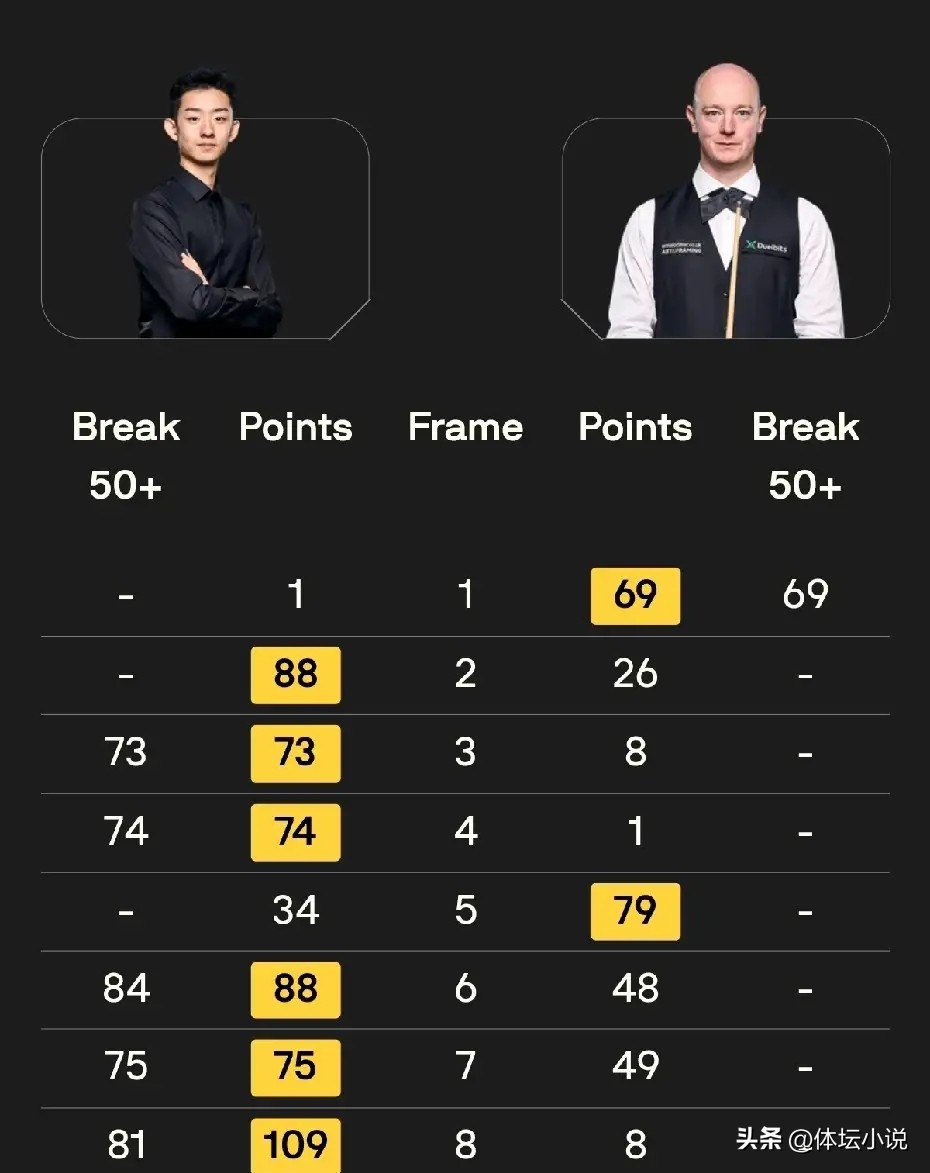 Wu Yize versus Wakelin. Wu Yize is a Chinese rising star, performing brilliantly this season. Wakelin is also a tough opponent, highly competitive and capable against any player. Both have claimed ranking event titles this season, qualifying for the Tour Championship. After the match began, Wakelin struck first, winning the opening frame with a single visit to seize the early advantage. Subsequently, the match turned one-sided, with Wu Yize's precision proving unstoppable. He unleashed full firepower, delivering five 70+ breaks, mounting a 6-1 offensive surge to temporarily lead 6-2, gaining主动权 for advancement. In the second stage,只需再赢四局 he can secure the quarter-final ticket, striving to join Zhao Xintong!