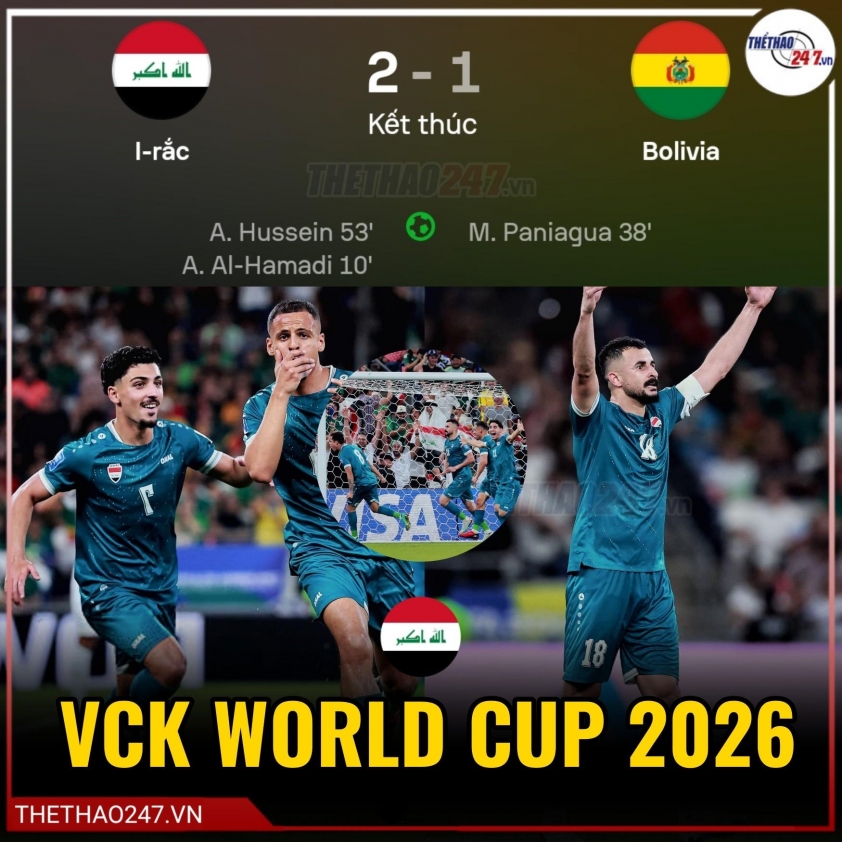 Against Bolivia, Iraq was considered the underdog but started confidently. In the 10th minute, Ali Al Hamadi scored the opening goal from a corner kick header. Bolivia quickly responded and equalized 1-1 in the 38th minute thanks to Moises Paniagua. However, the turning point came in the second half when Ayman Hussein scored the decisive goal for a 2-1 victory, thereby helping Iraq officially qualify for World Cup 2026.
