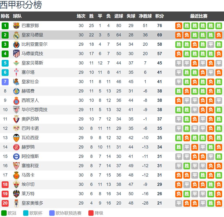 With 30 rounds completed in La Liga, 8 rounds remain this season.Barcelona stands at 25 wins, 1 draw, and 4 losses with 76 points; Real Madrid has 22 wins, 2 draws, and 5 losses with 69 points—a gap of 7 points.Given this 7-point difference, the La Liga title race this season may be effectively over, with Barcelona poised to claim the league championship and successfully defend their title in the near future.