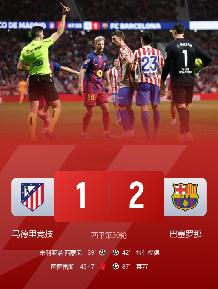 In another key match of La Liga's 30th round, Atletico hosted Barcelona. In this encounter, Simeone Jr. opened the scoring first, Olmo assisted Rashford to level the score, González received a yellow and then a straight red (later changed to a yellow), and Lewandowski, coming off the bench, scored the winning goal. Thus, Barcelona secured a 2-1 comeback victory away against the strong Atletico side, taking all 3 points and winning the first of their three upcoming meetings. This extends their lead at the top of the La Liga table to 7 points, also boosting confidence for their Champions League quarter-final matches against the same opponent.