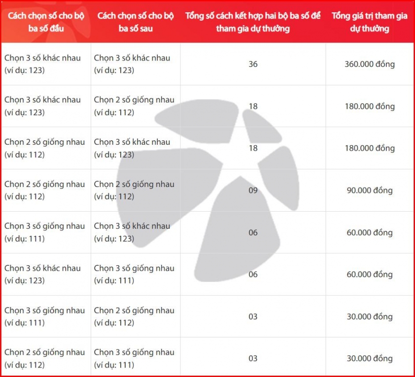 - For the play method covering multiple sets of three numbers:Participants select from 3 to 20 sets of three numbers. Each number in a set is chosen from the set of numbers 0 to 9. Then, the system software helps the player generate all possible combinations of 2 sets of three numbers from the selected sets for participation. Compare the combinations of two sets of three numbers with the draw results to determine the prize.