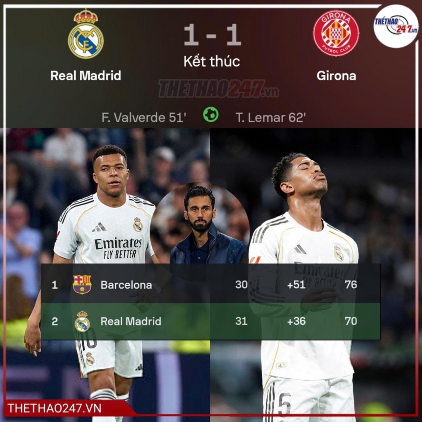 This result keeps the Royal team in second place with 70 points, 6 points behind leaders Barcelona, who also have one less match played. Despite the widening gap, Arbeloa refuses to accept claims that Real Madrid has "raised the white flag" in the race.
