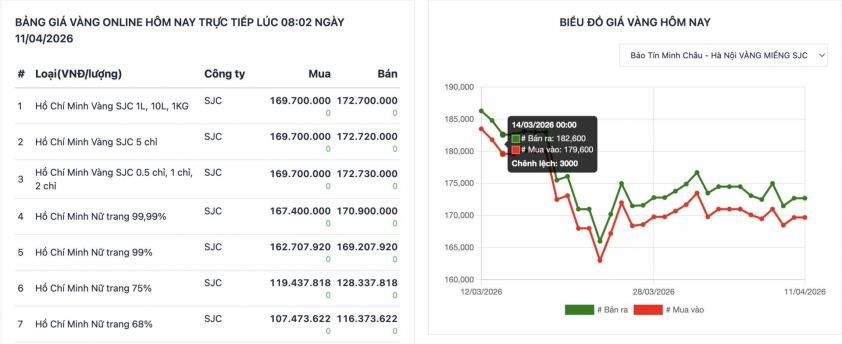 Updated at 8:02 AM on April 11, domestic 9999 gold prices recorded a stable trend, as major enterprises maintained their listed prices unchanged compared to the previous session, with the common selling price around 170.9 million VND per tael.