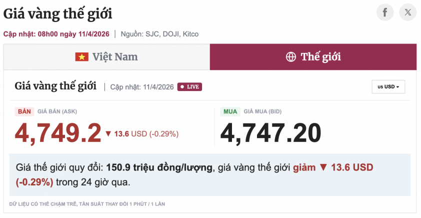 World gold prices reversed slightly lower in the trading session on April 11 morning as adjustment pressure emerged after the previous upward momentum. According to data updated at 8:00 AM, the selling price (ask) is around 4,749.2 USD/ounce, while the buying price (bid) reached 4,747.2 USD/ounce.