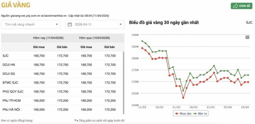 Updated at 7:50 AM on April 11, domestic gold bar prices recorded a sideways trend, as many major brands maintained their listed prices unchanged compared to the previous session, with the common selling price around 172.7 million VND per tael.