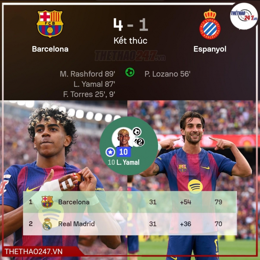 The early goal helped Barcelona play even more confidently. In the 25th minute, it was again the combination between Yamal and Torres that brought the second goal to widen the gap. This time, Yamal assisted Torres to finish neatly inside the penalty area, raising the score to 2-0 before the first half concluded.