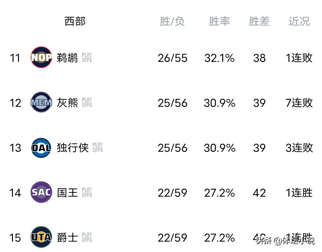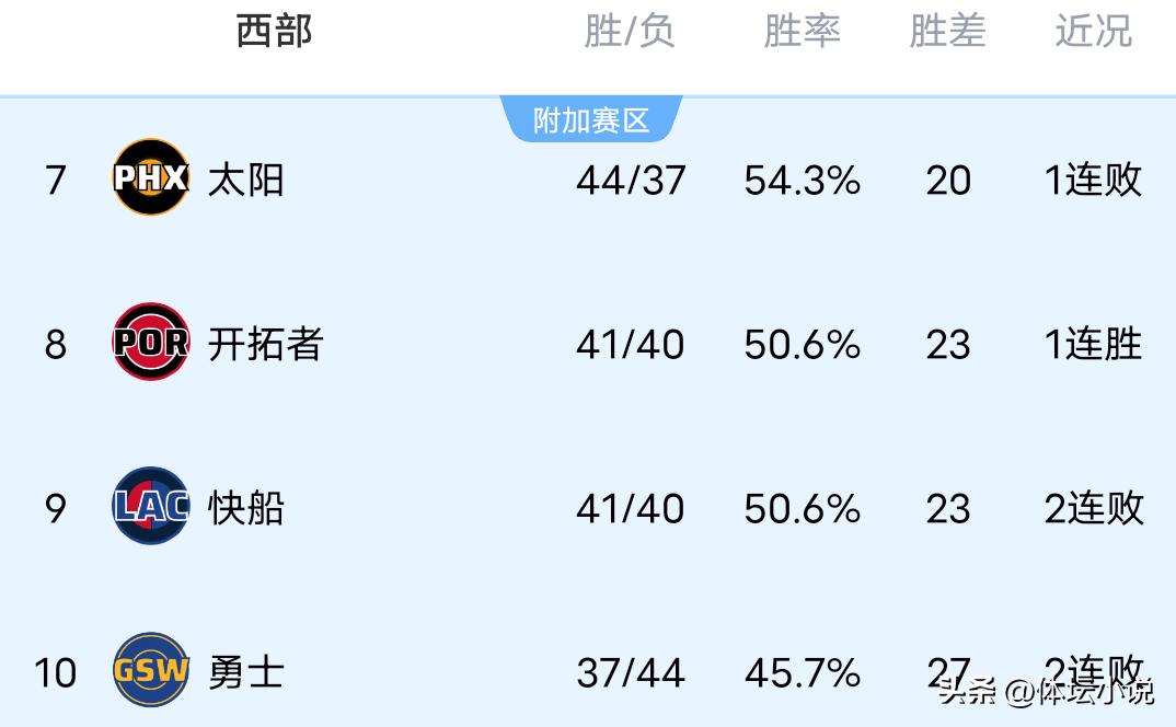 On April 12 Beijing time, NBA regular season games continued. After several fierce battles concluded yesterday, among them the Grizzlies suffered a 101-147 defeat to the all-around Jazz, in a crucial positioning game the Clippers lost 97-116 to the Trail Blazers, the Warriors unexpectedly lost 118-124 to the super underdog Kings, and the Suns collapsed with a 73-101 defeat to the Lakers. Consequently, the Western Conference standings have been released, leading to major turmoil and changes in the playoff race situation. The Clippers were surpassed by the Trail Blazers and fell to ninth place, the Trail Blazers rose to eighth, the Suns are seventh, and the Warriors locked in tenth place!