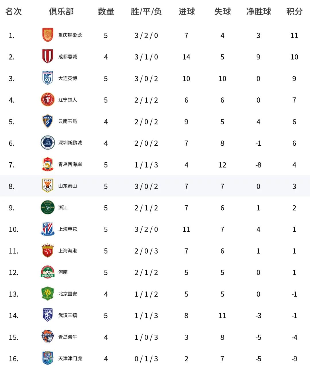 With this defeat, Wuhan Three Towns' situation becomes愈发艰难. After five CSL rounds, the team has scored 8 goals and conceded 11. Due to penalty points, its score remains at -1, ranking temporarily 13th, already无限接近降级区. In contrast,对手 Chongqing Tongliang Long, after winning, holds a 3-win, 2-draw unbeaten record暂登积分榜首. The落差 between the former champion and the newly promoted team is令人唏嘘.
