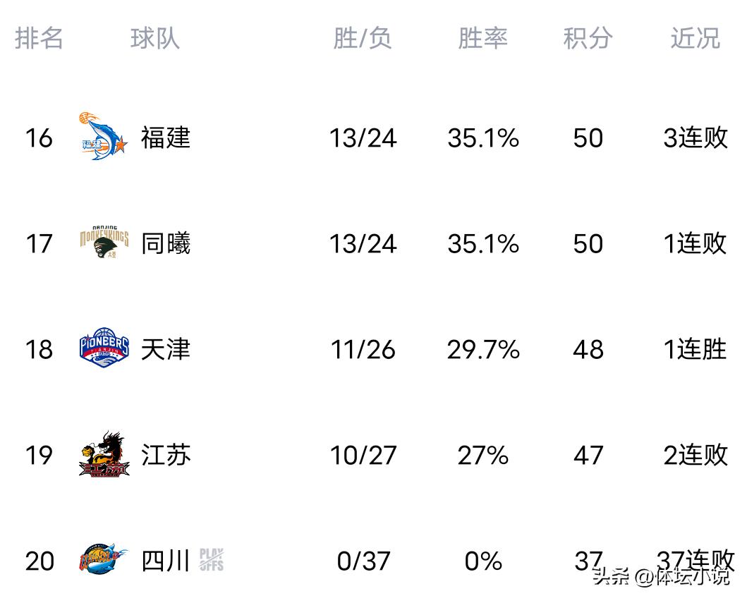 Sichuan versus Tianjin. Sichuan, a former CBA champion, now finds itself stuck at the bottom this season with hardly a win, a situation that evokes sighs. In this match against Tianjin, there was no glimpse of hope for victory. In the first quarter, Tianjin opened with a 26-14 lead, putting Sichuan behind by double digits. Although Sichuan's offense improved subsequently, it remained suppressed by Tianjin, and the point gap continued to expand steadily. The suspense of the game gradually faded, ending with Tianjin delivering a crushing defeat to Sichuan, handing them their 37th consecutive loss. Currently, it seems highly likely Sichuan will not win a single game this season; it remains uncertain which team might offer them a compassionate victory.