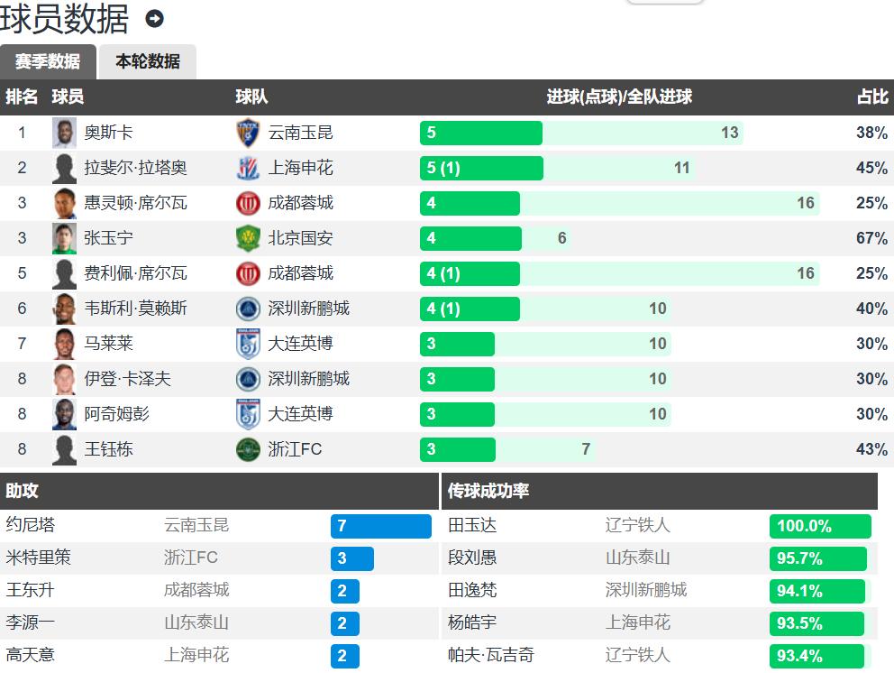 On the CSL scorers list, Oscar and Laton with 5 goals tied for first, four players with 4 goals tied for third; on the CSL assists list, Jonica with 7 assists far ahead, Mitrice with 3 assists ranked second.
