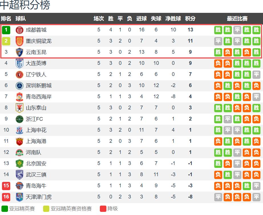 - Shanghai Port: 1 point ranked eleventh, defending champion's performance declined severely, losing 3 matches in the first 5 rounds.