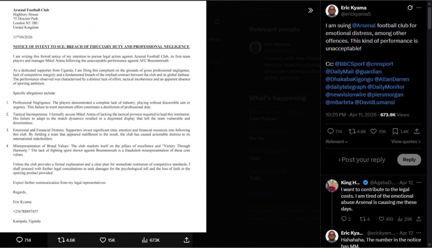 A wave of anger is rising within the Arsenal fan community following a 1-2 defeat at home against Bournemouth. Notably, a fan from Uganda has caused a stir by deciding to sue the club he supports.