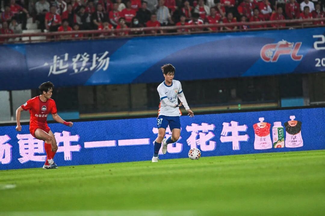 Chen Zeshi chest-controlled the ball and passed while surrounded by two Henan players,充分展现了 his relaxed心态 in the match. Compared to his debut four years ago, he is now more physically robust, has richer match experience, and a more relaxed match mentality. Originally very versatile, he is now fully showcasing himself.