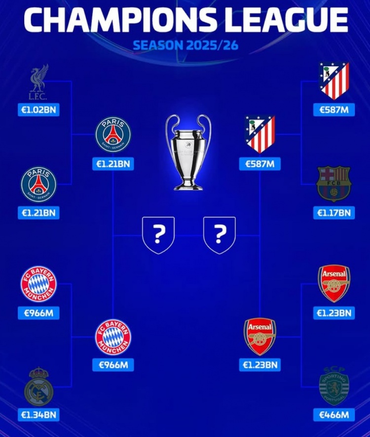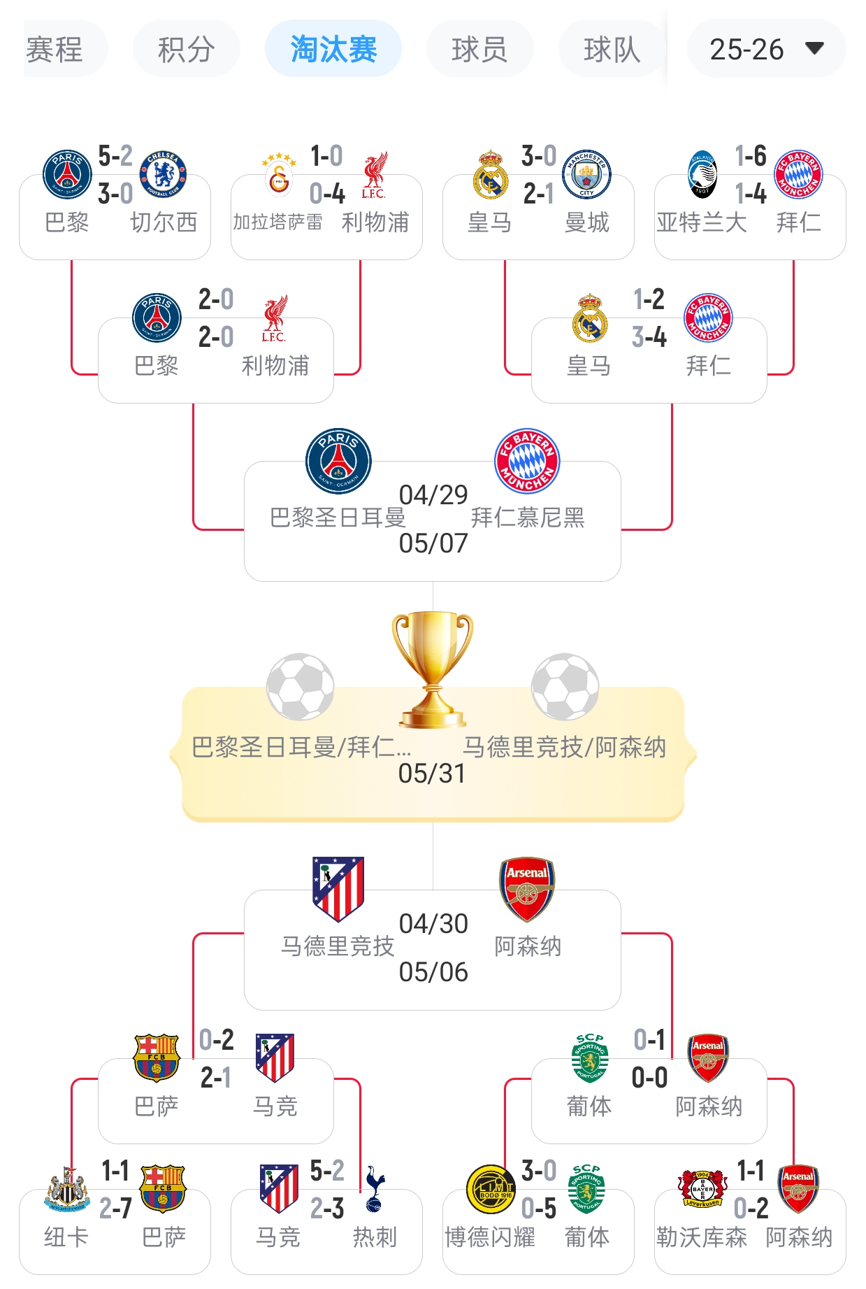 Following Paris's double victory over Liverpool, Bayern's double victory over Real Madrid, Atletico Madrid's tough elimination of Barcelona, and Arsenal's tough elimination of Sporting Portugal, the Champions League semifinalists have all been determined, namelyFrench league leader Paris, also the defending Champions League champion; German league leader Bayern; Spanish league fourth-place Atletico Madrid; English league leader Arsenal.