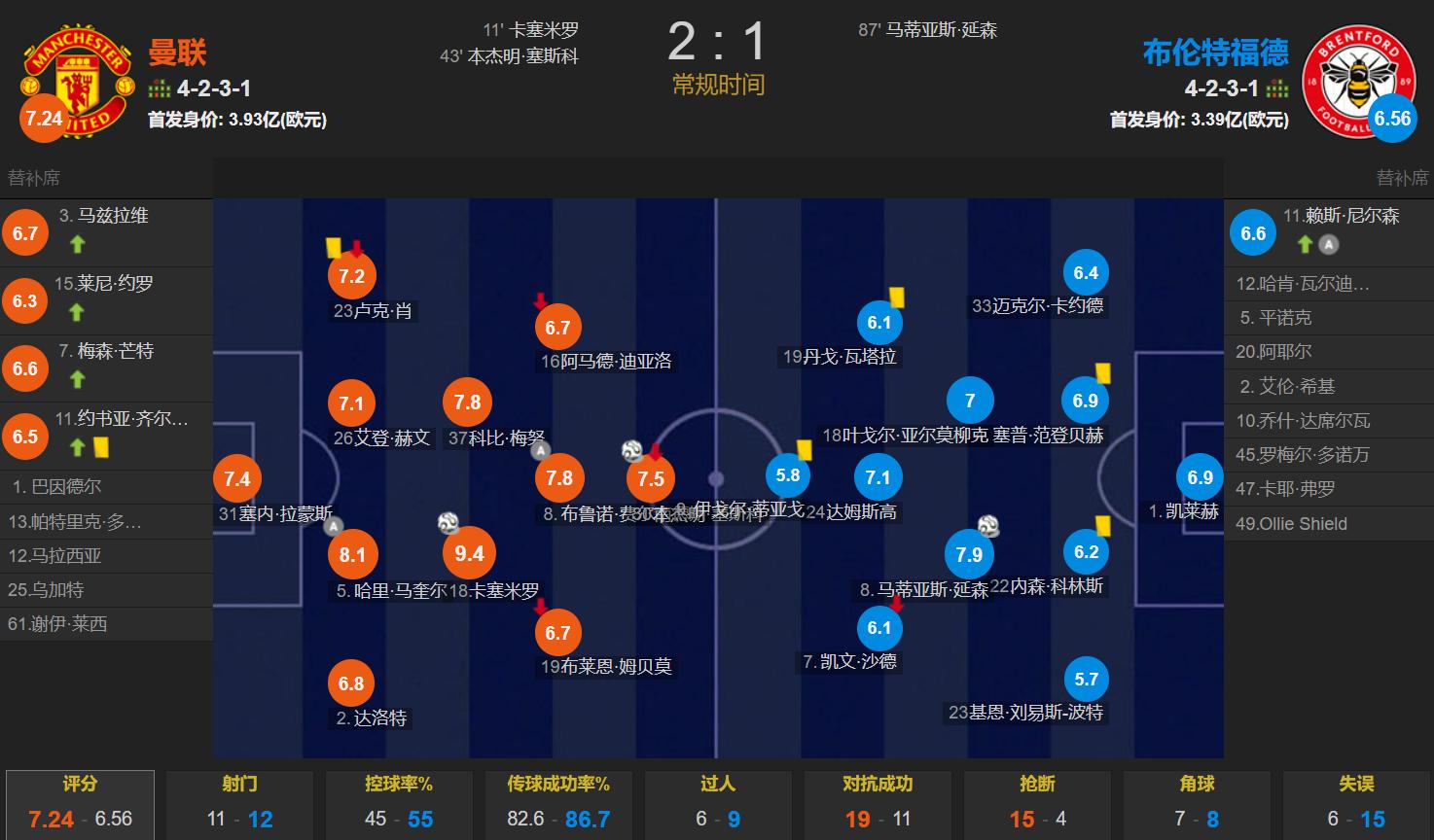 The match was evenly contested, with Brentford even taking control away from home, possessing more ball possession and shots. Manchester United's possession was only 45%, with 11 shots and 6 on target, while Brentford had 12 shots and 4 on target. Manchester United's victory was primarily due to two reasons. First, Carrick has developed Manchester United's strongest midfield. Casemiro is simply a god-like figure; this veteran Brazilian midfielder's headers have become a crucial scoring method for Manchester United, excelling in both attack and defense. Mainoo is essentially a Red Devils version of Kanté; if Amad's shot into the empty net had gone in, Mainoo's assist could have contended for the best goal of this round. Captain Bruno Fernandes earned his 19th assist of the season in the Premier League, just one assist away from the record of 20 assists in a single Premier League season held by Henry and De Bruyne. With four Premier League matches remaining this season for Manchester United, Bruno Fernandes breaking the record is imminent.