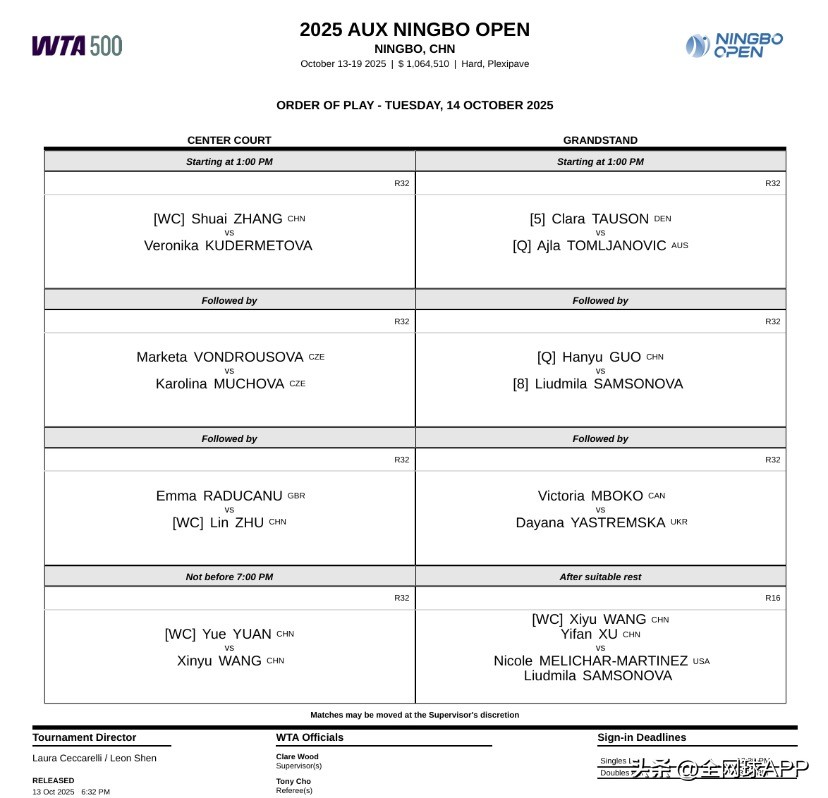 On October 13, 2025, the WTA500 Ningbo tournament began, with Wang Xinyu and Andreyeva present at the opening ceremony. In the opening round of the women's singles, Chinese player Wang Xiyu, who started the match, lost her leads of 3-0 in the first set and 3-1 in the second, ultimately falling 5-7, 3-6 to 7th seed Schneider after a grueling 1 hour 51 minutes, failing to reach round two.