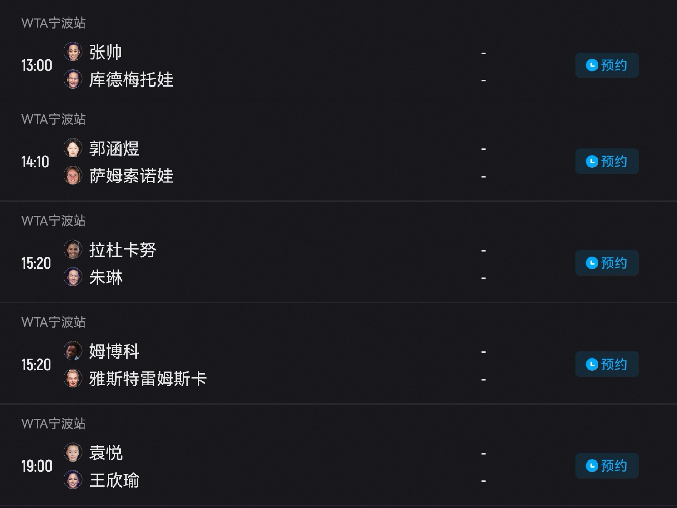The WTA500 Ningbo event schedule for tomorrow (2025.10.14) includes Wang Xinyu, Zhang Shuai, Yuan Yue, Guo Hanyu, Zhu Lin, and others, with live broadcasts on Youku.