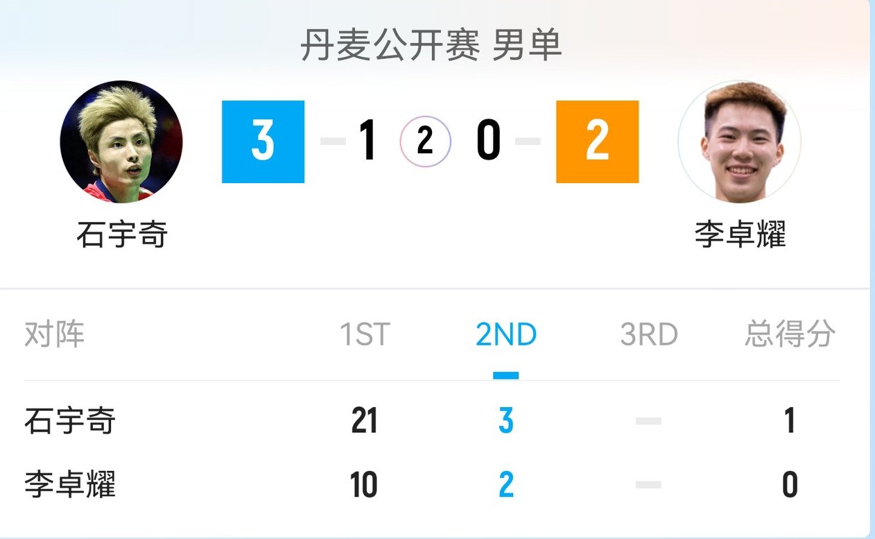 This match is played as best-of-three games, each to 21 points. Shi Yuqi took the first game 21-10 over Li Zhuoyao. Currently, they are in the second game, with Shi Yuqi leading 3-2.