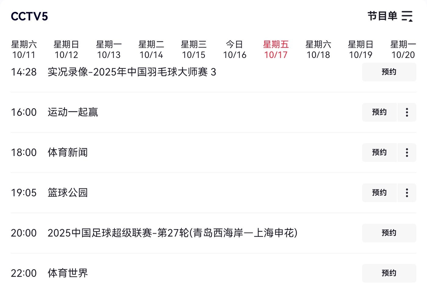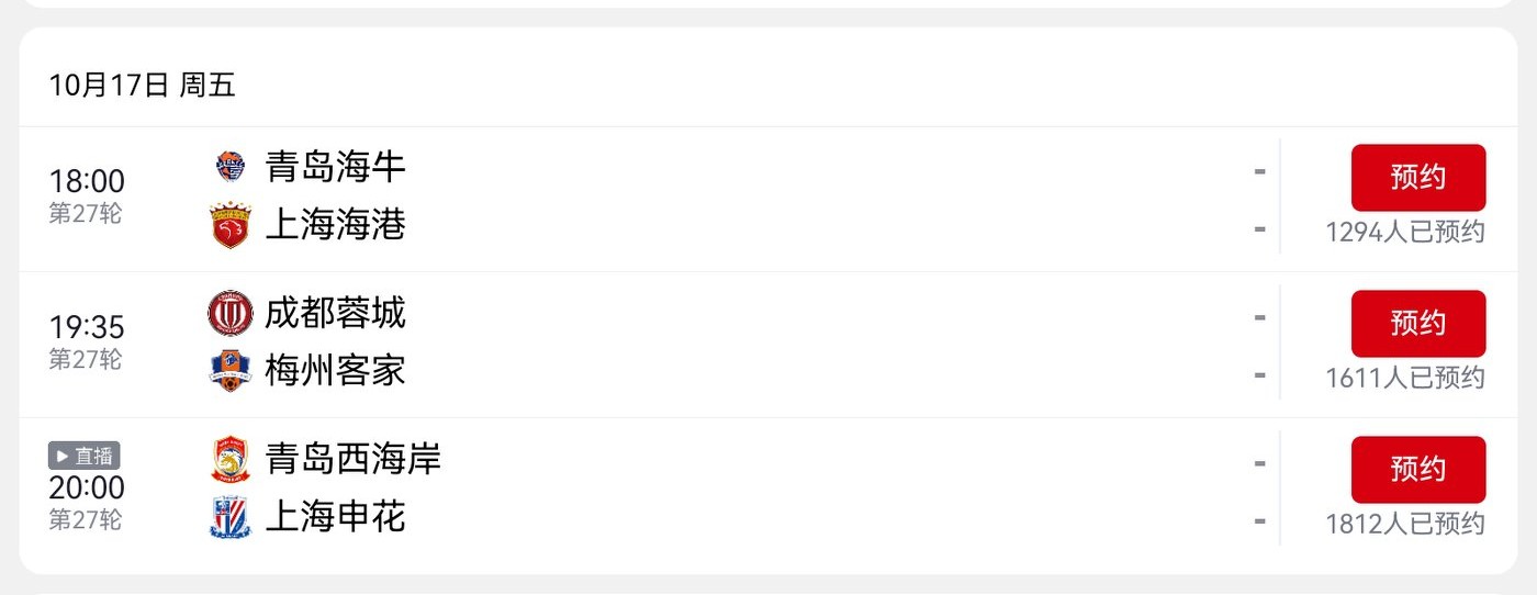 The Chinese Super League matches tomorrow (2025.10.17) feature three games starting, live on CCTV-5 and Migu Video.