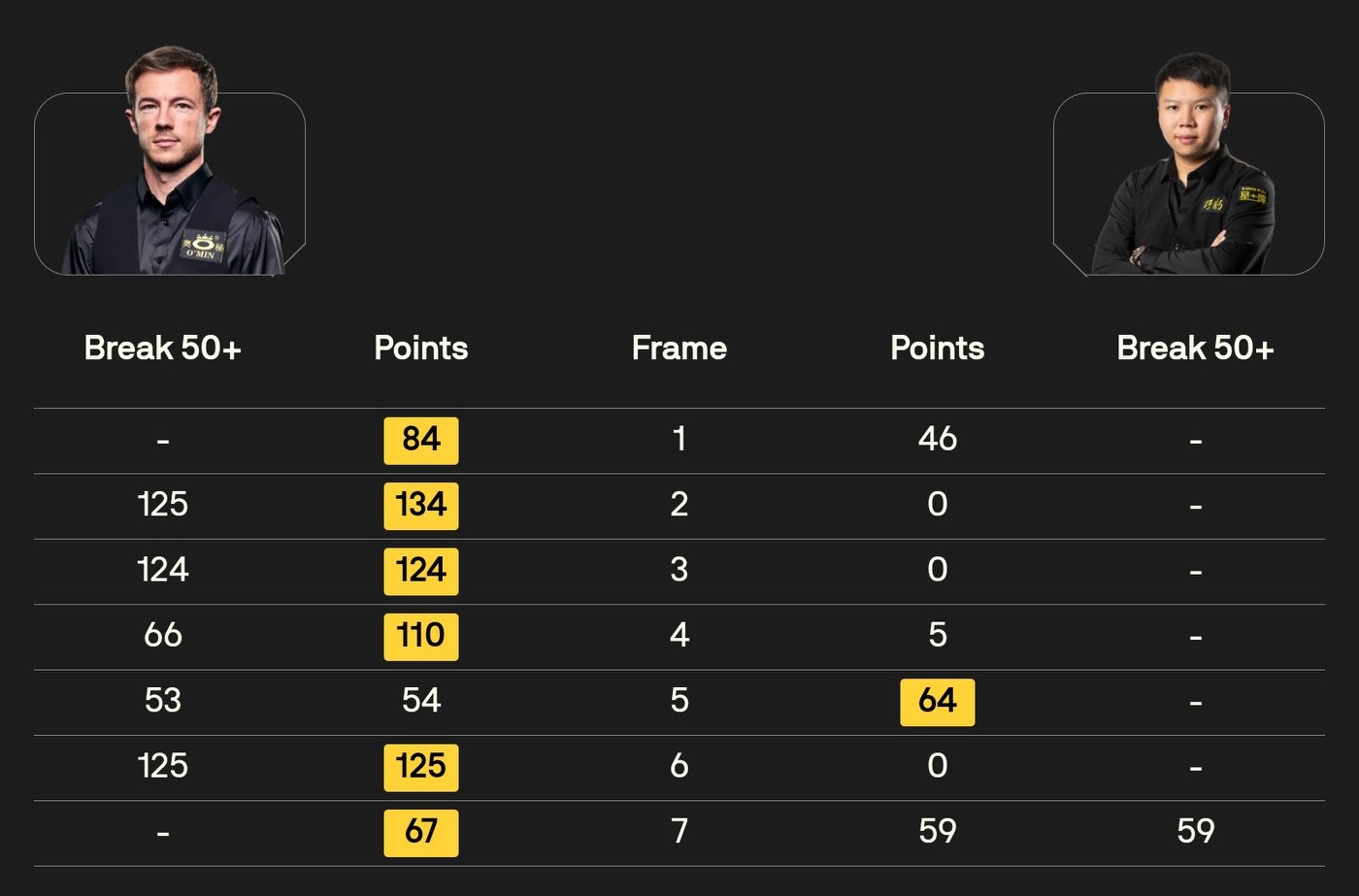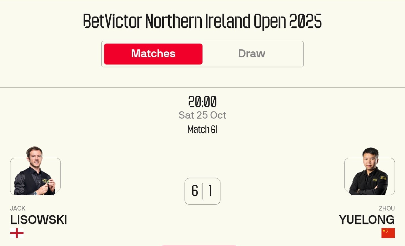 Lisowski performed excellently today, starting strong with four straight frames to lead Zhou Yuelong 4-0. After the break, Zhou fought back to claim the fifth frame, making it 1-4. Afterwards, Lisowski gave Zhou no further chances and decisively won 6-1 to advance to the final.