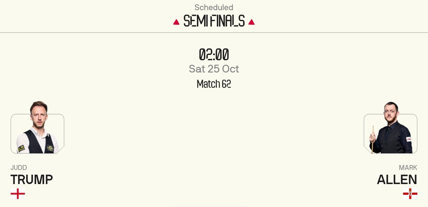 Also included is the schedule for the other semifinal: tomorrow at 2 AM, Trump will face Mark Allen in a best-of-11 frames match, broadcast live on Migu Video and Huya. I believe Trump will win and meet Lisowski in the final, with Xiao Si Ji taking the championship. Do you think this scenario will play out?