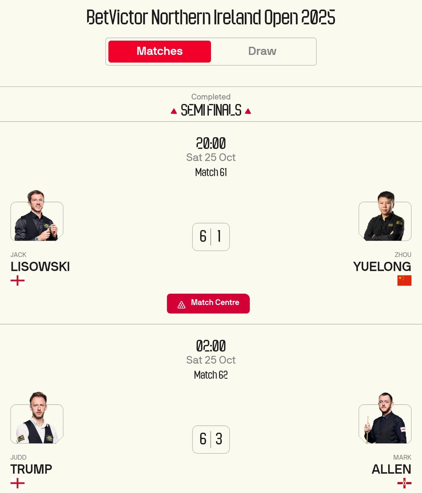The most recent news from the Snooker Northern Ireland Open: Lisowski and Trump won their matches to move on to the final, while Zhou Yuelong and Mark Allen were eliminated after losing.