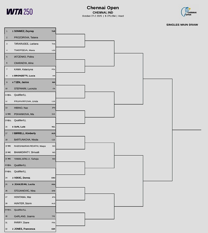 Chennai: Senmez and Jones lead the field, with Vikic, Zeng Limi, Bronzetti, Jiang Jiang, Biller, and Lulu Sun also competing.