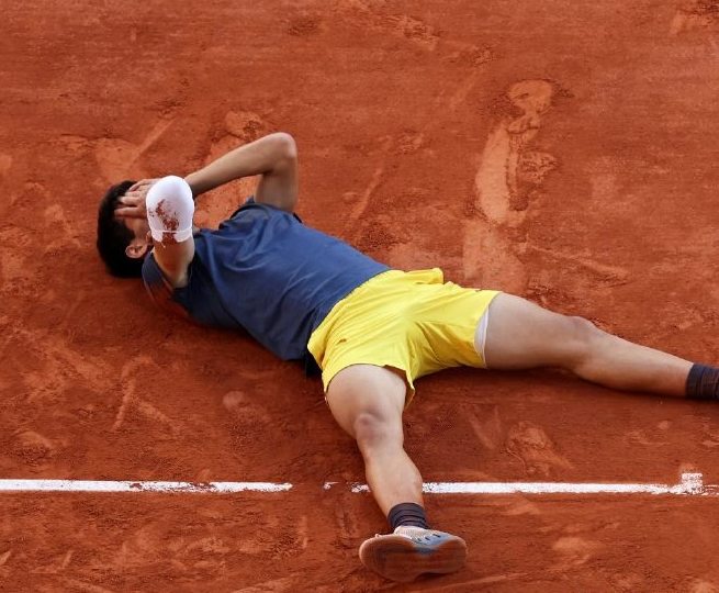 Finally, let's have a guess and recognition game. The picture below shows a player collapsing in celebration after a victory. Without any hints, can you identify who he is?