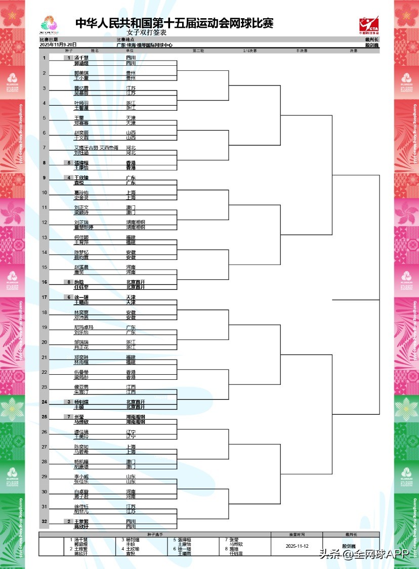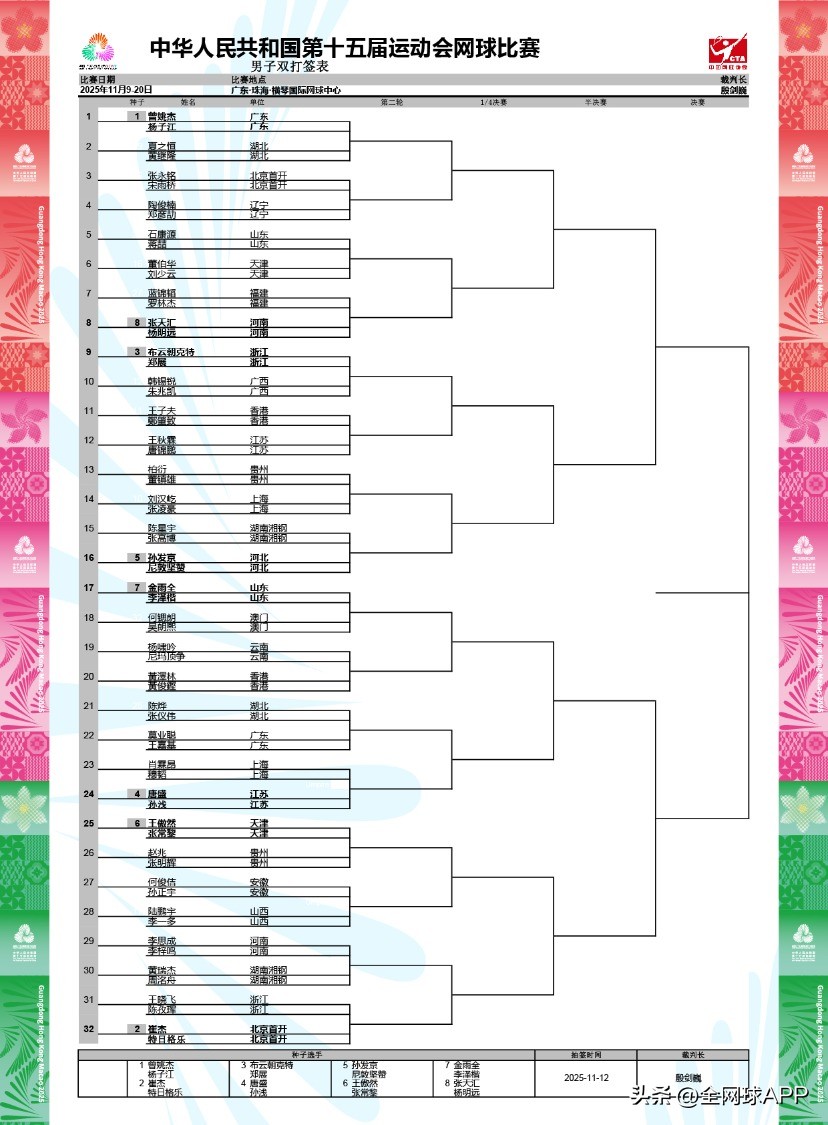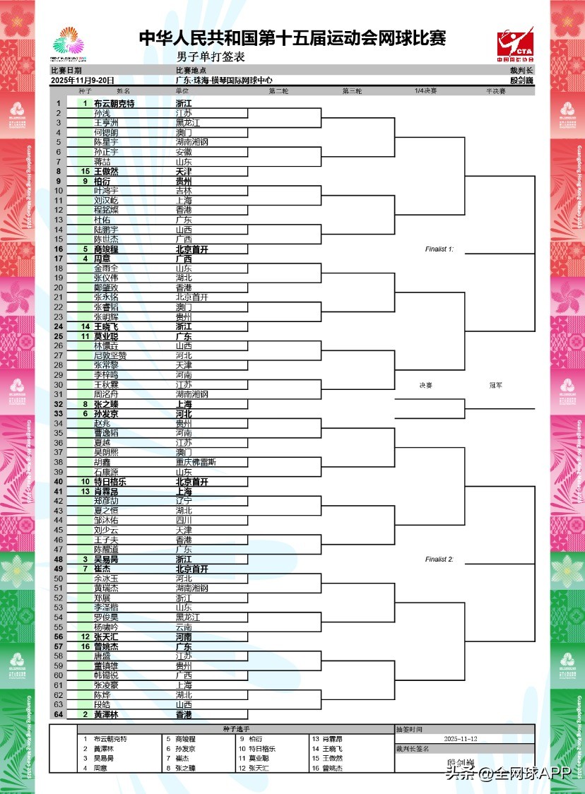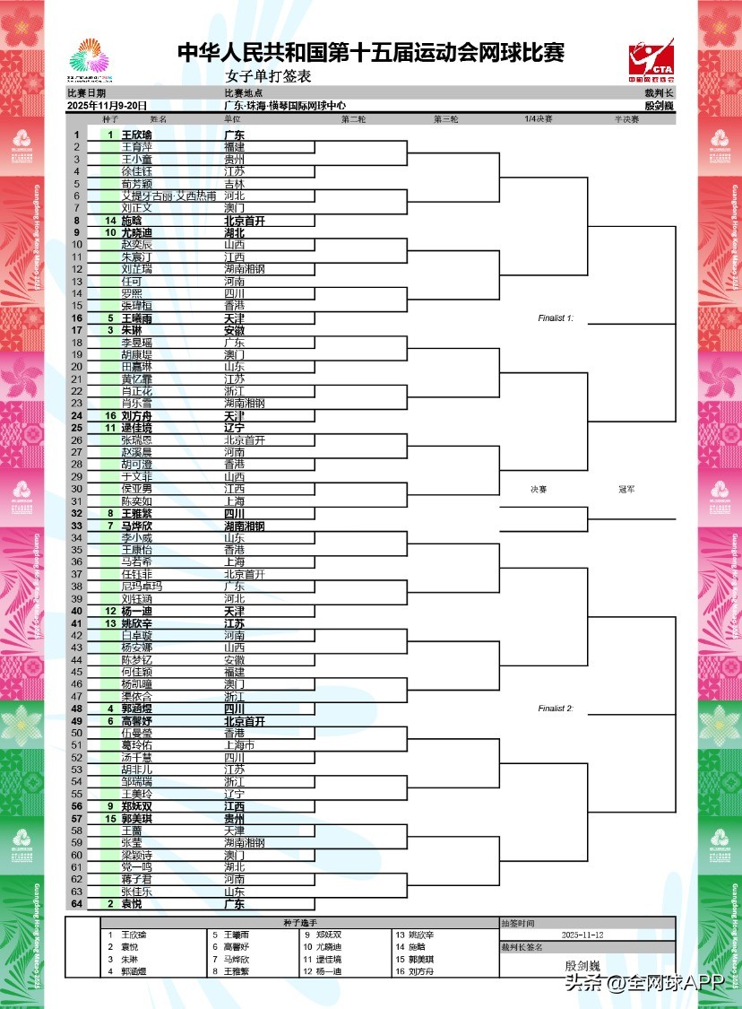網球項目單項比賽抽籤儀式今日舉行,男女單打和男女雙打的簽表正式公布。王欣瑜、袁悅、朱琳、王雅繁,以及張之臻、商竣程、布雲朝克特、吳易昺等選手均將參賽。單打賽事定於11月13日開始,雙打賽事則於11月14日展開。