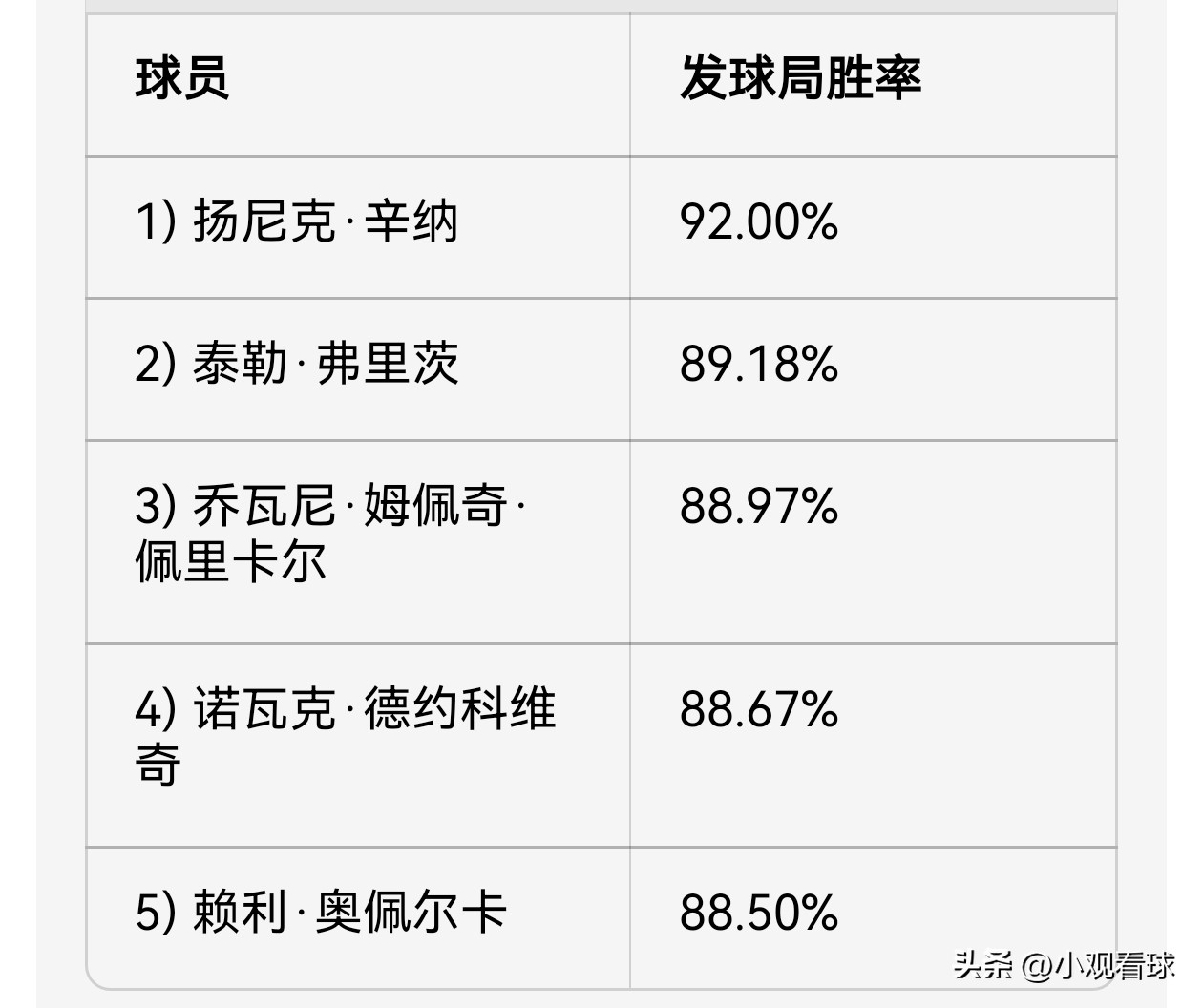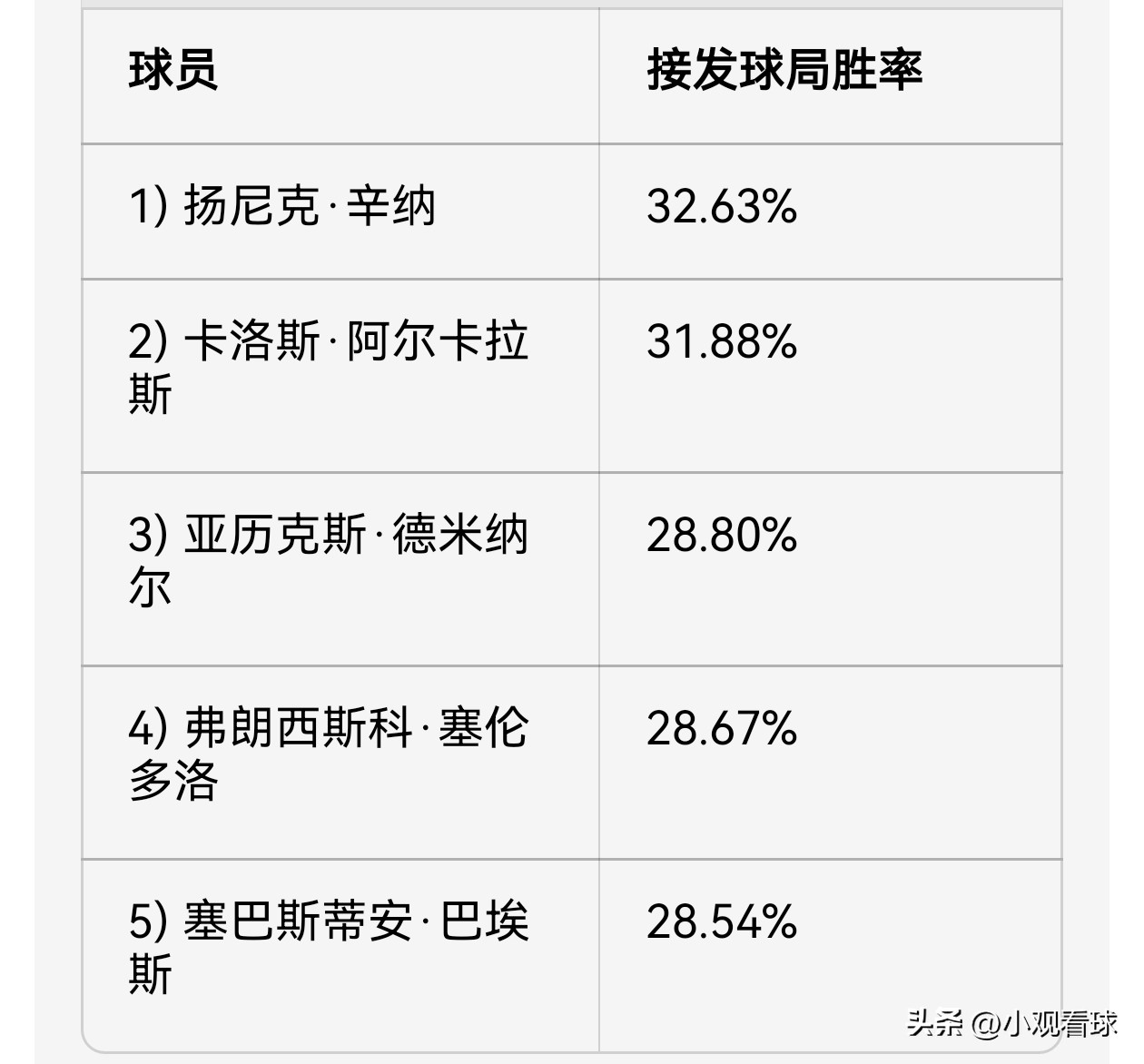 The gap between Sinner and other top players reflects his consistency in applying pressure during return games — notably, in 2024 when he earned the year-end No. 1 ranking, his return game win rate was only 28.3%.