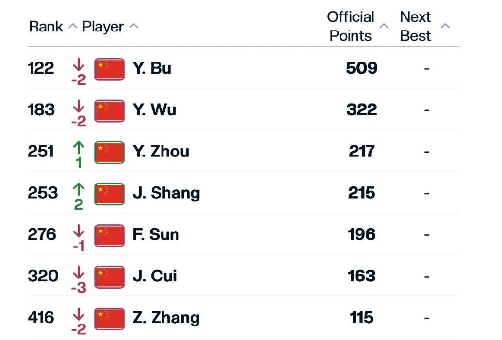 周意目前以第251位成為中國三哥,昔日中國一哥商竣程排名下滑至第253位,緊隨其後。若明年新賽季無傷病困擾,這位中國四哥重返二哥位置應不成問題。許多球迷和網友認為,布雲朝克特在冬訓期間最應該思考的,是2026賽季如何守住一哥寶座的現實問題。