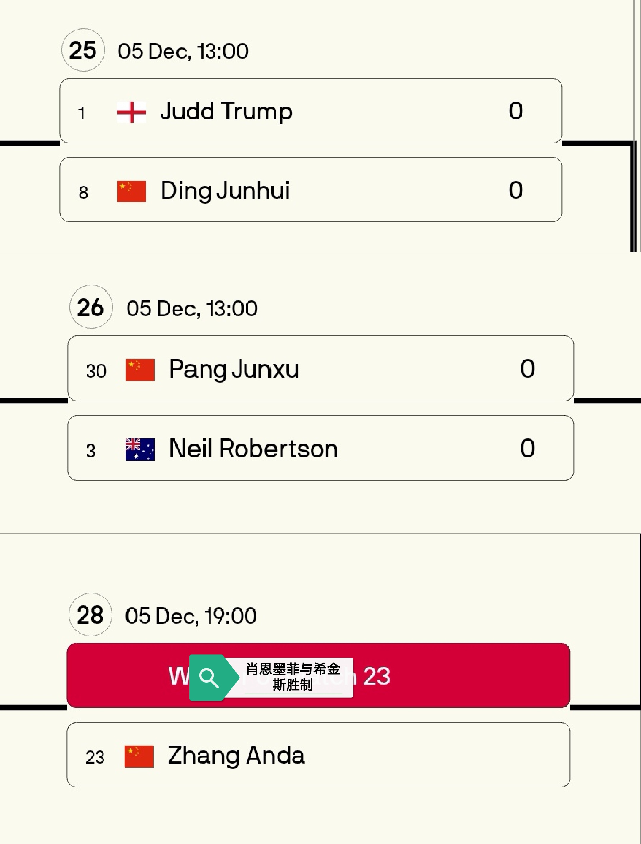 斯諾克英錦賽今日(2025.12.5)賽程,丁俊暉、張安達和龐俊旭參賽,CCTV-5、央視頻及虎牙直播。