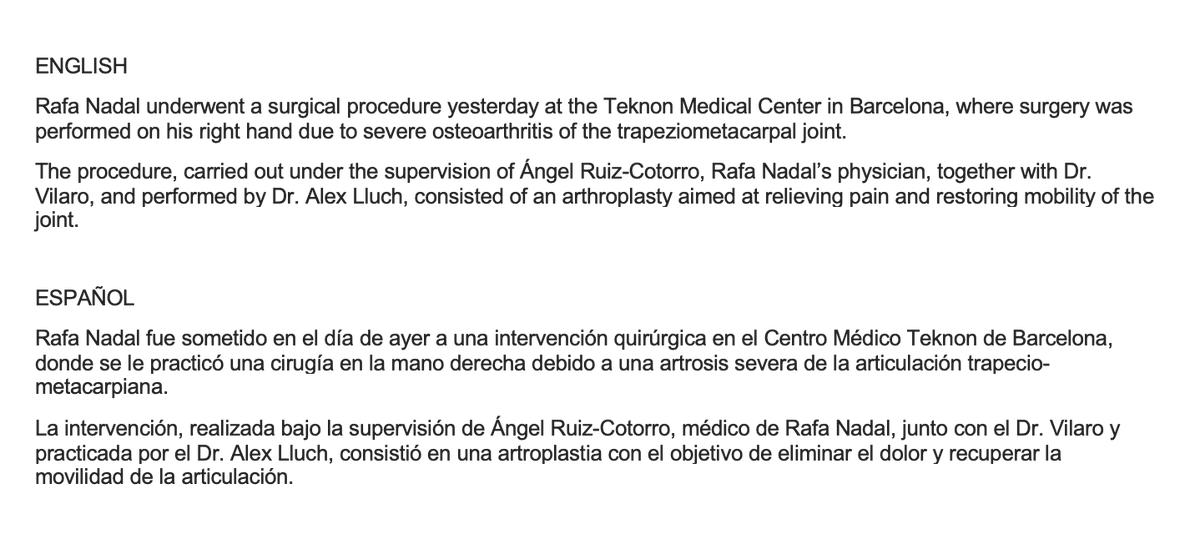The official statement released with the announcement read: “Nadal underwent surgery yesterday at the Teknon Medical Center in Barcelona. Due to severe osteoarthritis in the right thumb carpometacarpal joint, he received surgical treatment. The operation was supervised by Nadal’s primary doctor Ángel Ruiz-Cotorro and Dr. Villaró, with Dr. Alex Lluch performing the arthroplasty aimed at relieving pain and restoring joint mobility.”