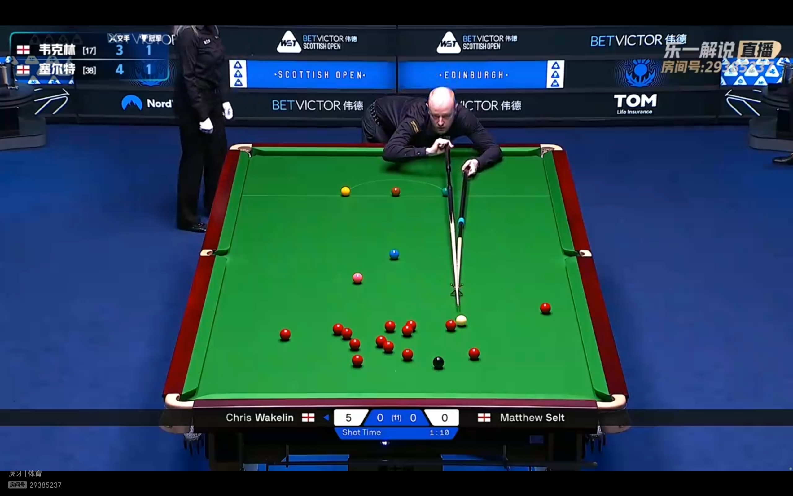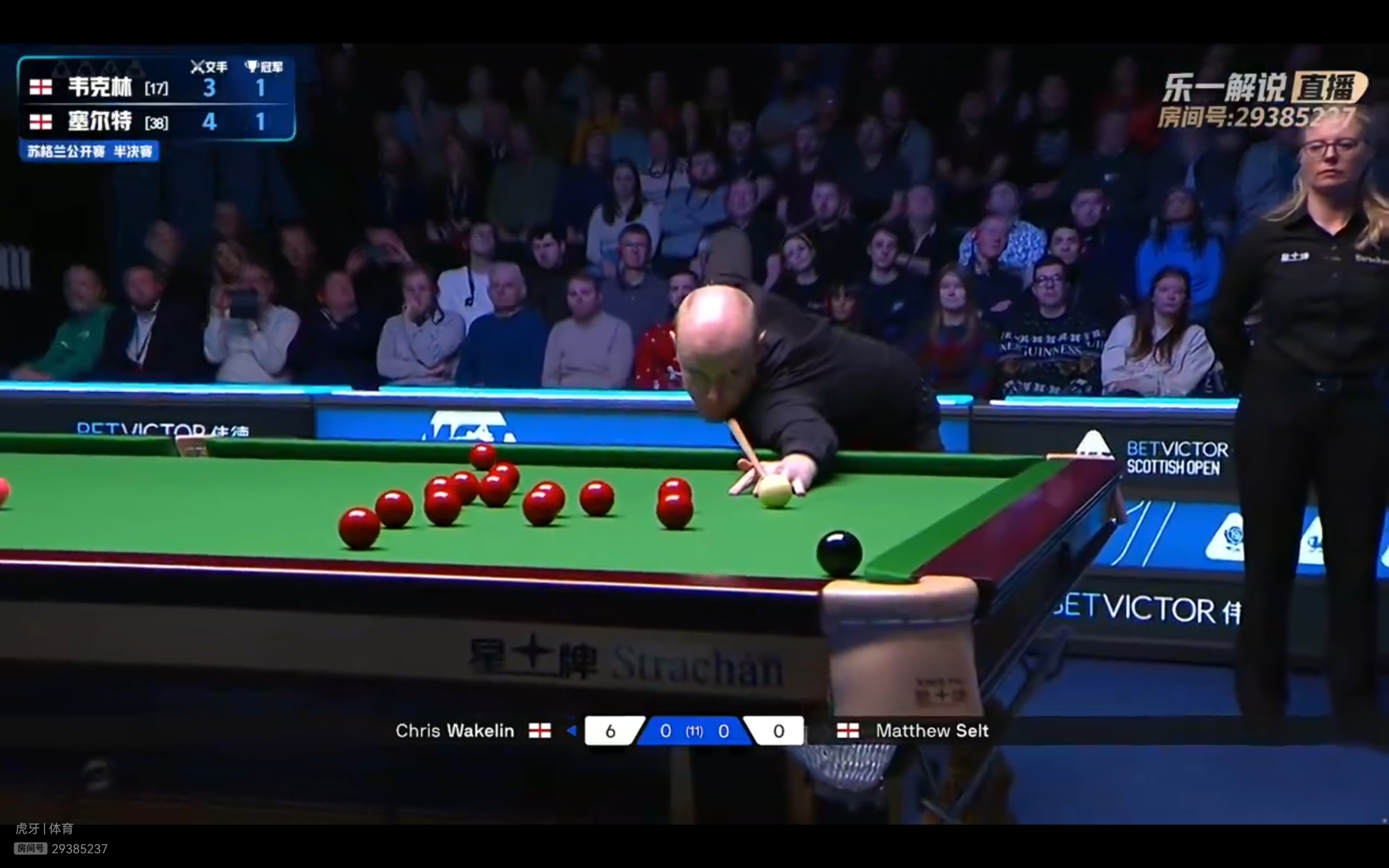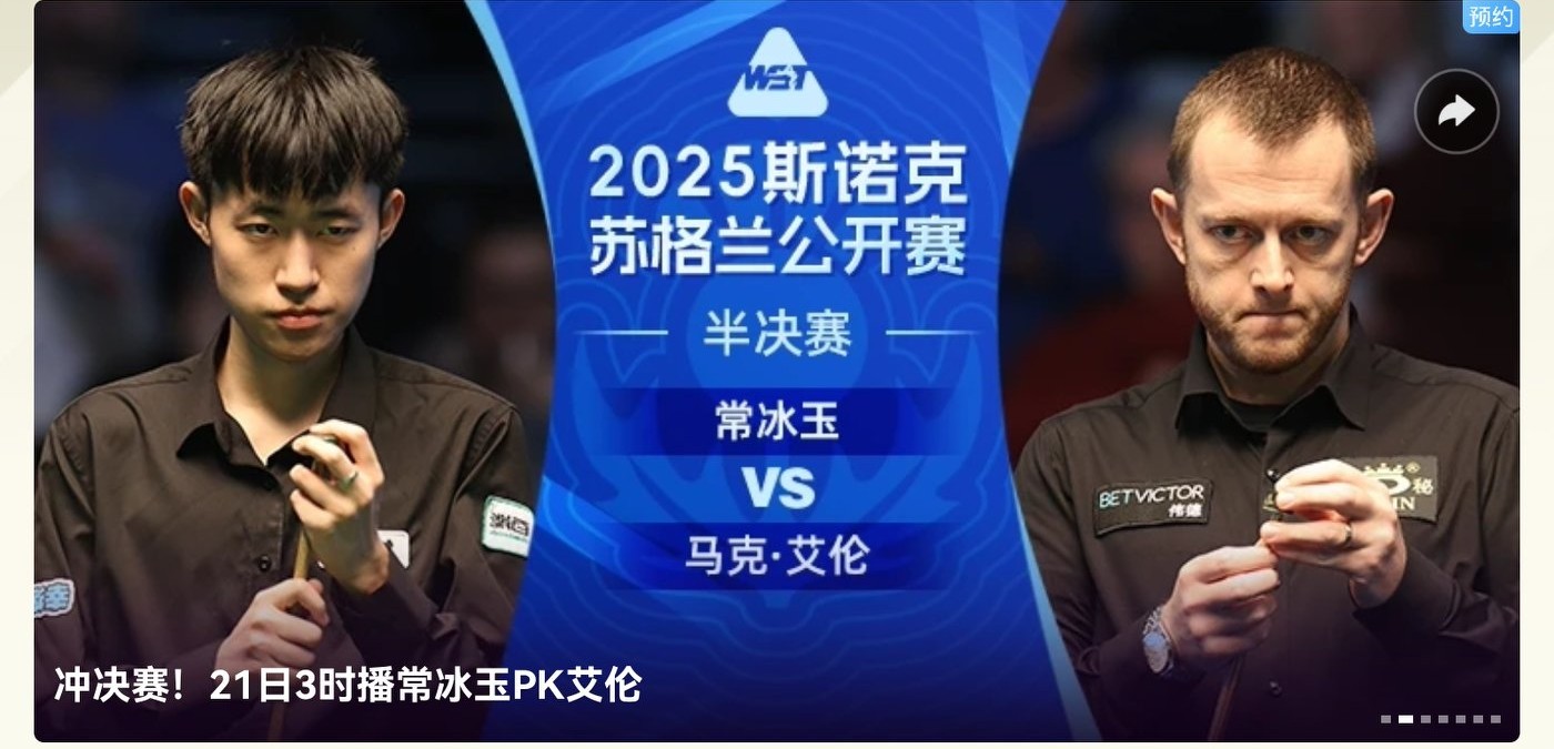 虎牙直播與咪咕視頻現正播放斯諾克蘇格蘭公開賽半決賽韋克林對塞爾特的賽事,隨後會轉播常冰玉對艾倫的比賽。