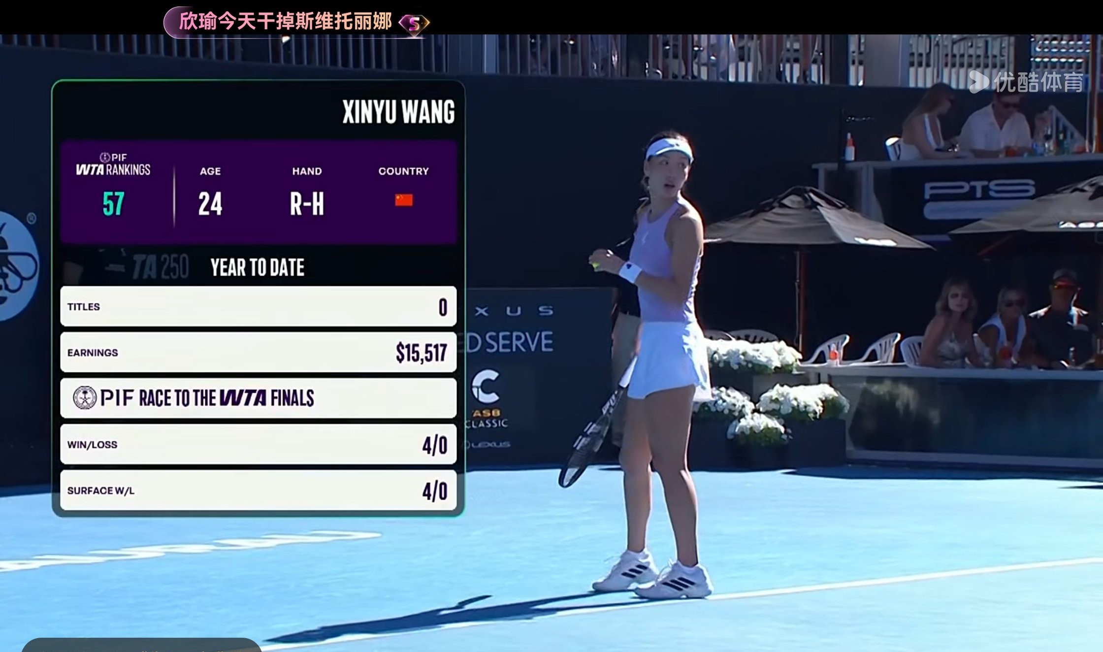 優酷體育頻道正在直播WTA250奧克蘭站決賽王欣瑜對戰斯維托麗娜的比賽。