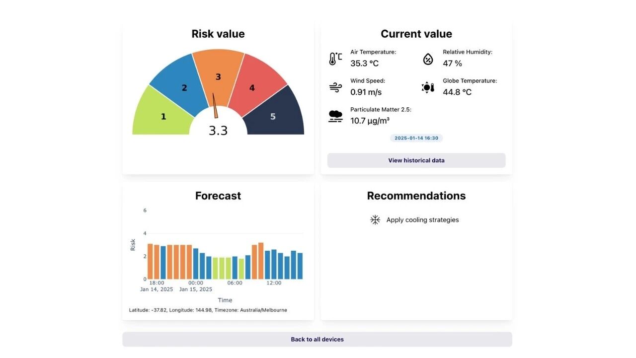 The Australian Open processes the collected data through an algorithm that calculates a heat stress scale from level 1 to 5, which is displayed in real time on a dashboard. This system can also forecast the heat stress level for the upcoming hours.